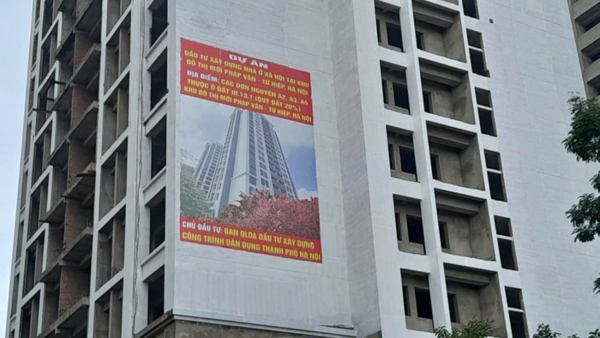 Theo ghi nhận, bên ngoài các khối nhà này đã được treo thông tin là dự án nhà ở xã hội tại Khu đô thị mới Pháp Vân - Tứ Hiệp do Ban Quản lý dự án đầu tư xây dựng công trình dân dụng thành phố Hà Nội làm chủ đầu tư tại các đơn nguyên A2, A3, A4 thuộc ô đất III.13.1 (quỹ đất 20%).