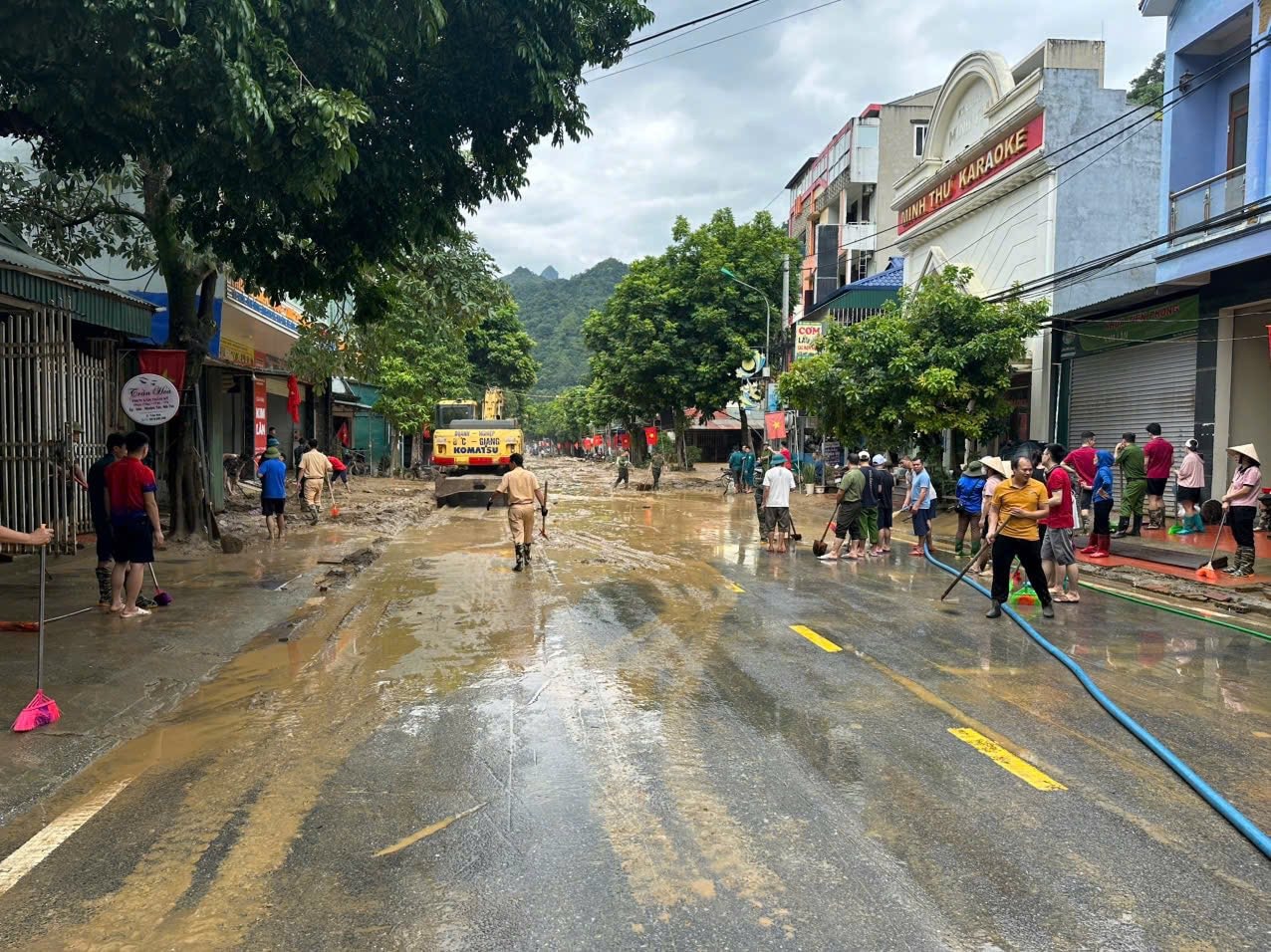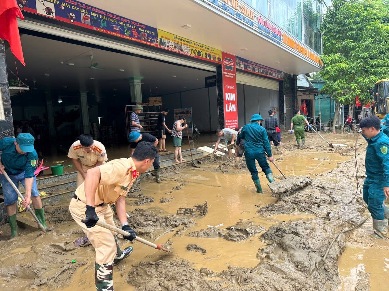 Ngay khi nước rút, Công an, Quân đội và người dân Cao Bằng bắt tay ngay vào dọn vệ sinh môi trường, sớm ổn định cuộc sống. Ảnh: Công an cung cấp