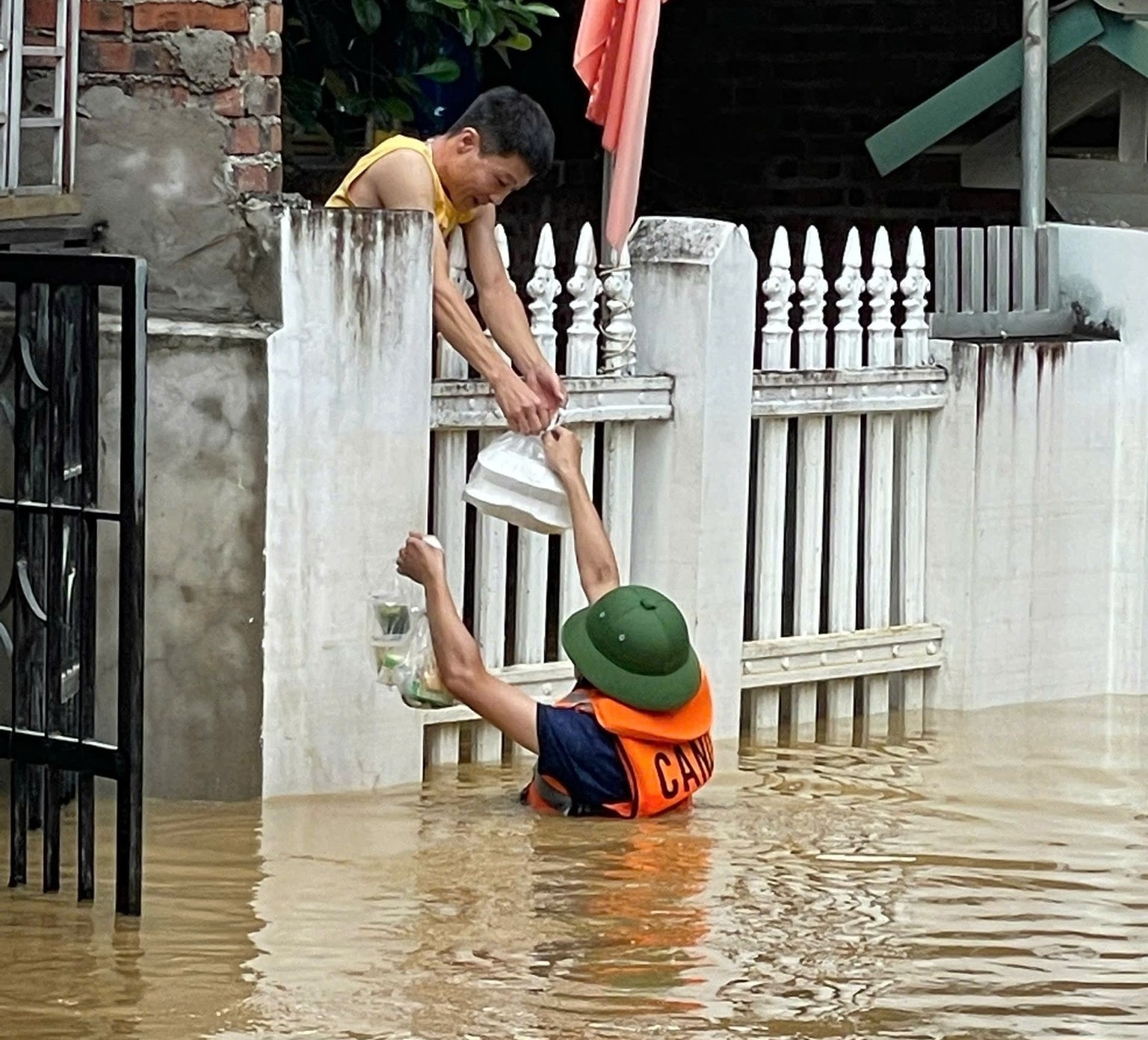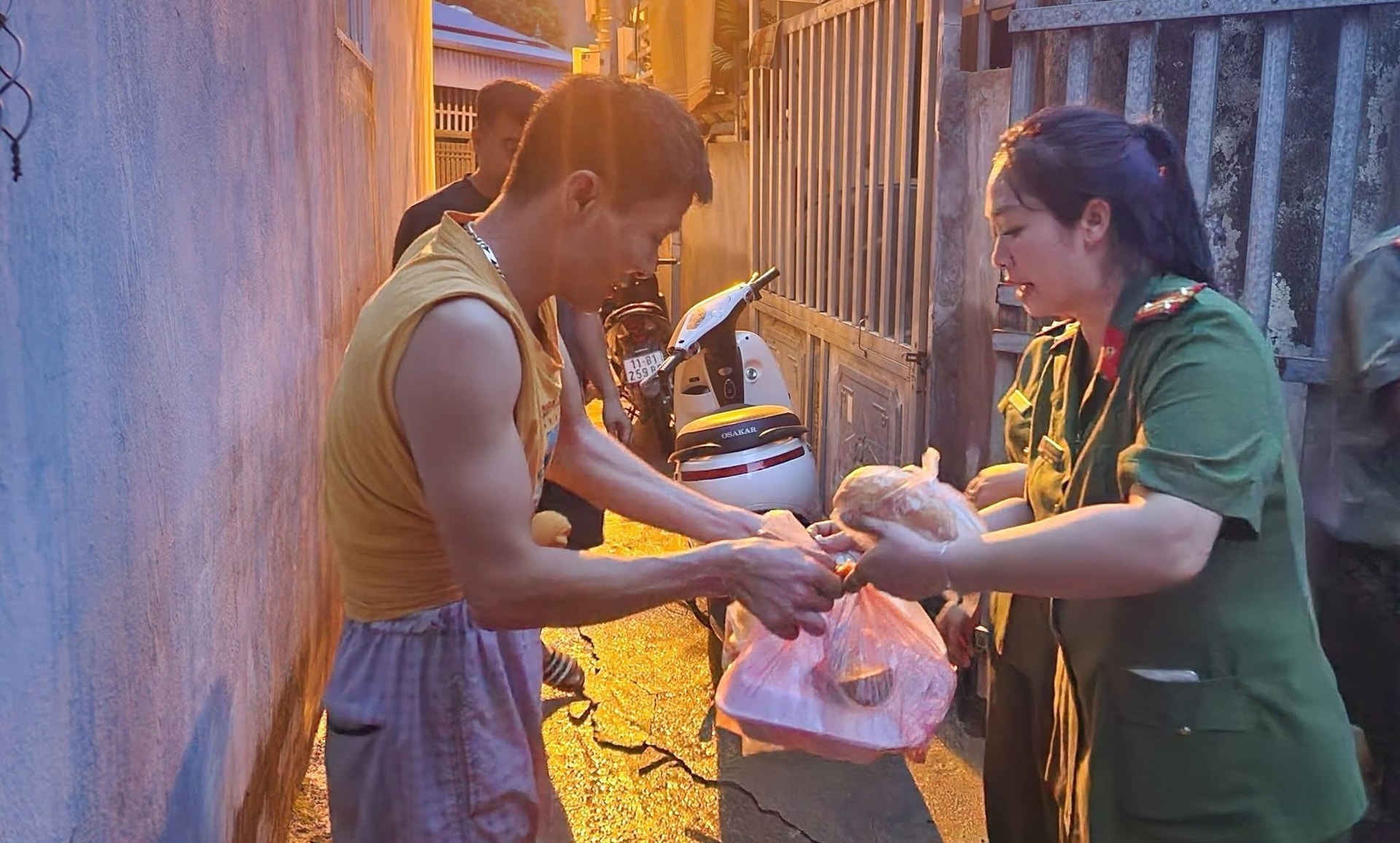 Công an phường Tân Giang "đi từng ngõ, gõ từng nhà" phát cơm hộp, bánh mì cho các gia đình bị ảnh hưởng do bão số 10. Ảnh: Công an cung cấp