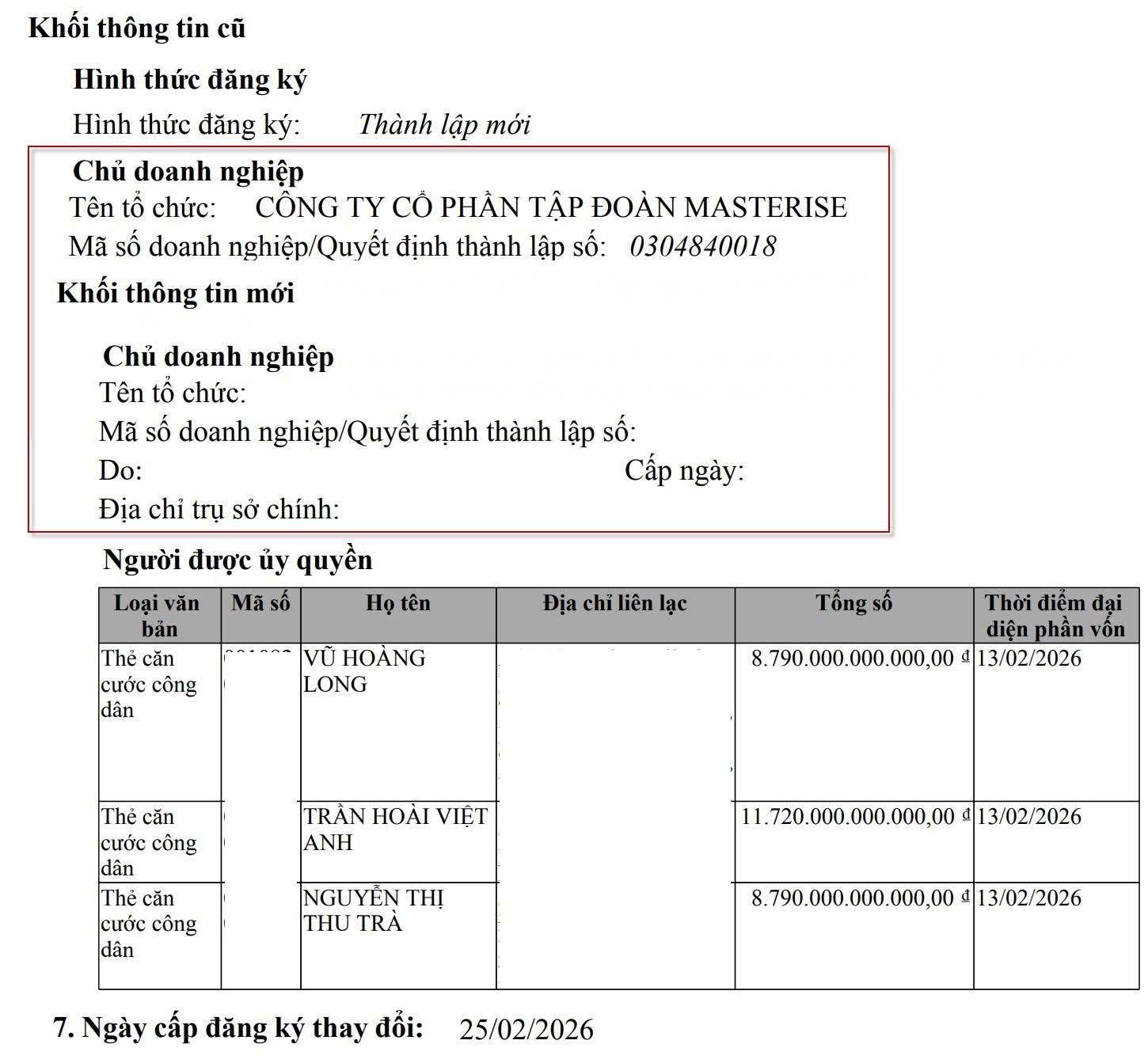 Ba cá nhân được ủy quyền hoàn toàn gồm: Ông Trần Hoài Việt Anh (11.720 tỷ đồng, tương đương 40% cổ phần), ông Vũ Hoàng Long (8.790 tỷ đồng, tương đương 30%) và bà Nguyễn Thị Thu Trà (8.790 tỷ đồng, tương đương 30%). Thời điểm đại diện vốn từ 13/2.
