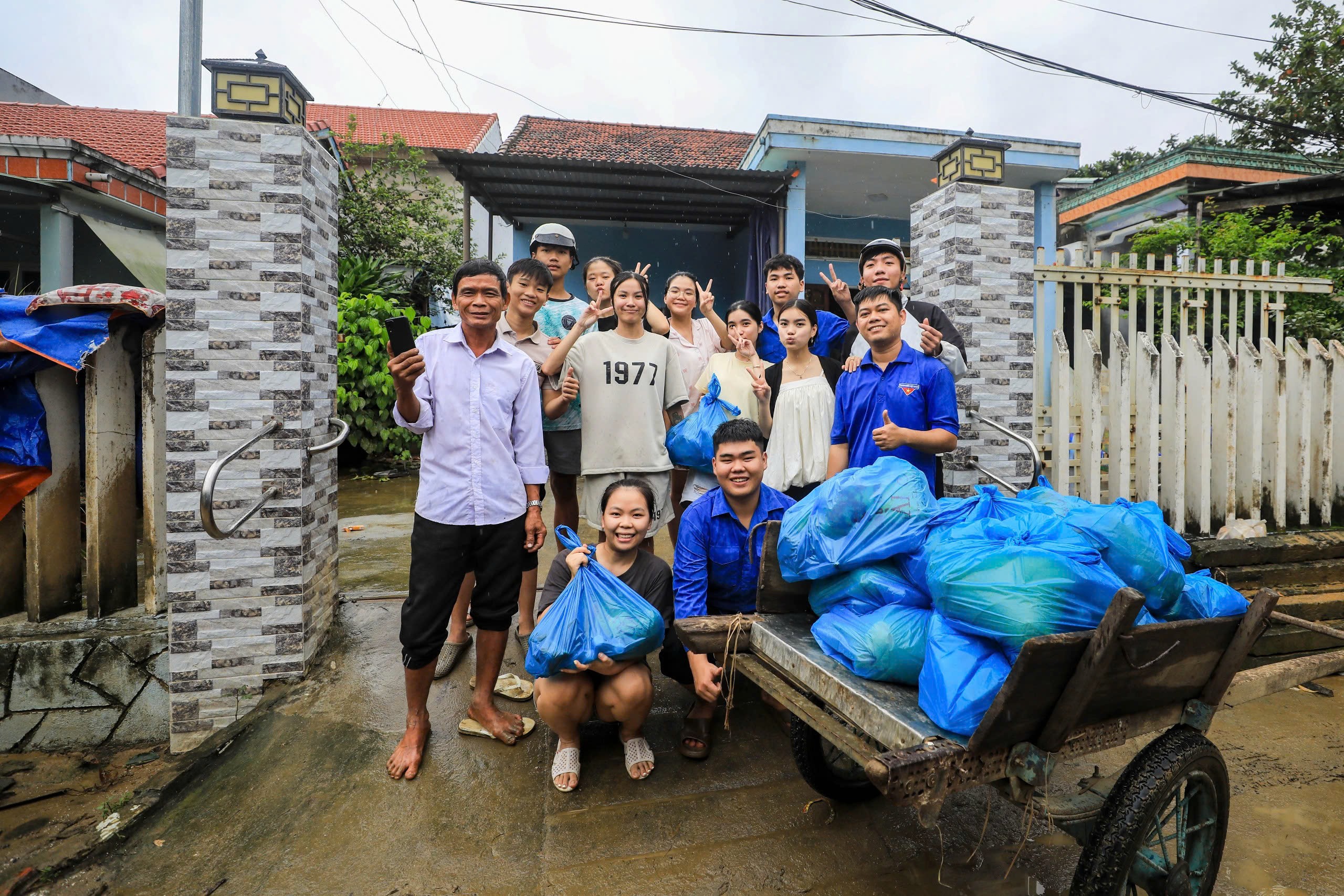 Buổi chiều, những chuyến xe chở nhu yếu phẩm từ trung tâm Đà Nẵng tìm vào đến xóm nhỏ. Các bạn trẻ trao tận tay bà con từng túi quà, trong đó có mì tôm, sữa, nước suối… Ai cũng lấm lem bùn đất, nhưng nụ cười thì sáng rỡ. Họ khiêng giúp từng bao hàng, cẩn thận đặt lên bậc thềm cho những nhà già yếu. Nhìn cảnh đó, bà Phan Thị Mười trú tổ 2 xúc động: “Bà con mình cực mấy cũng chịu, chỉ mong người thương nhau như ri hoài.”