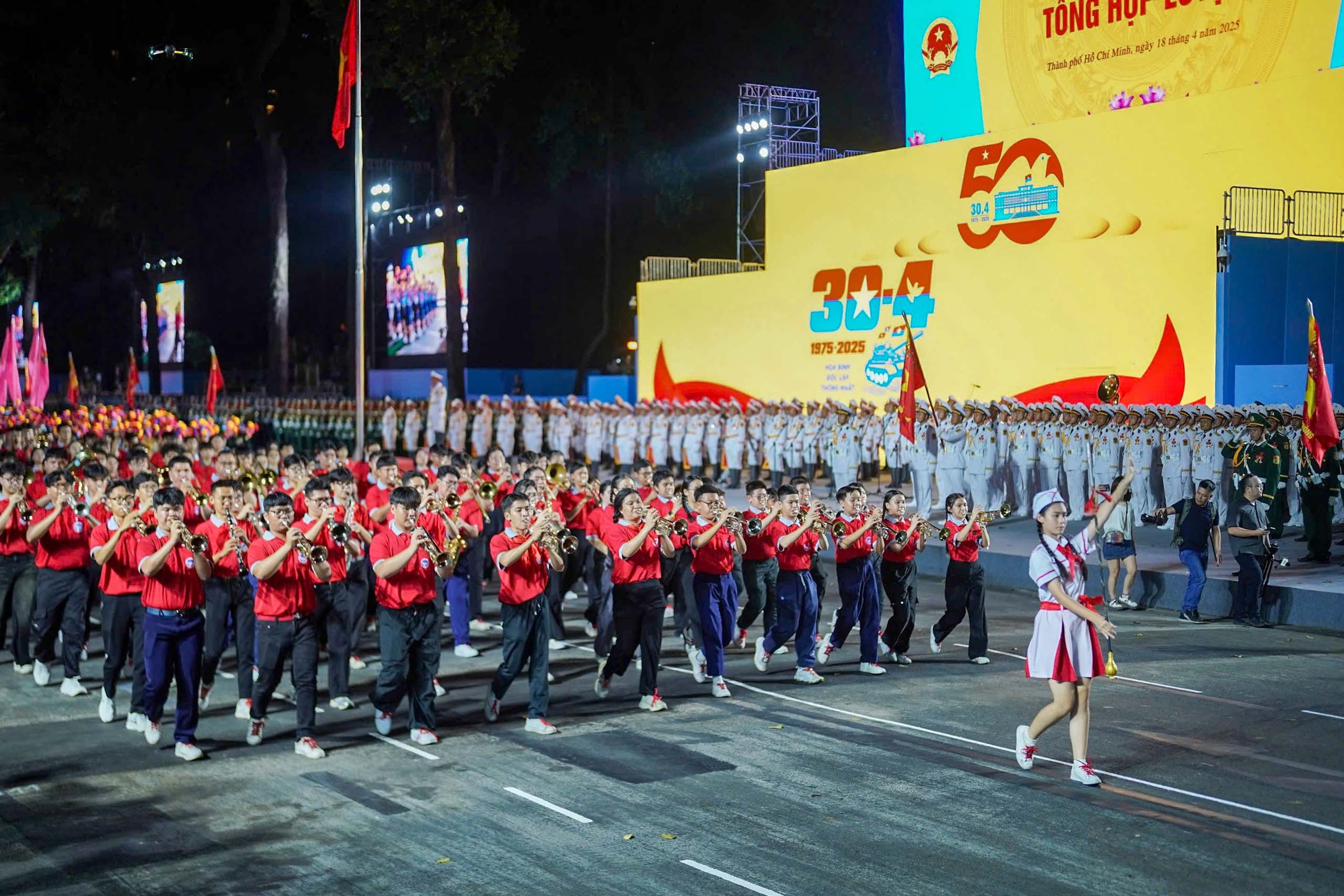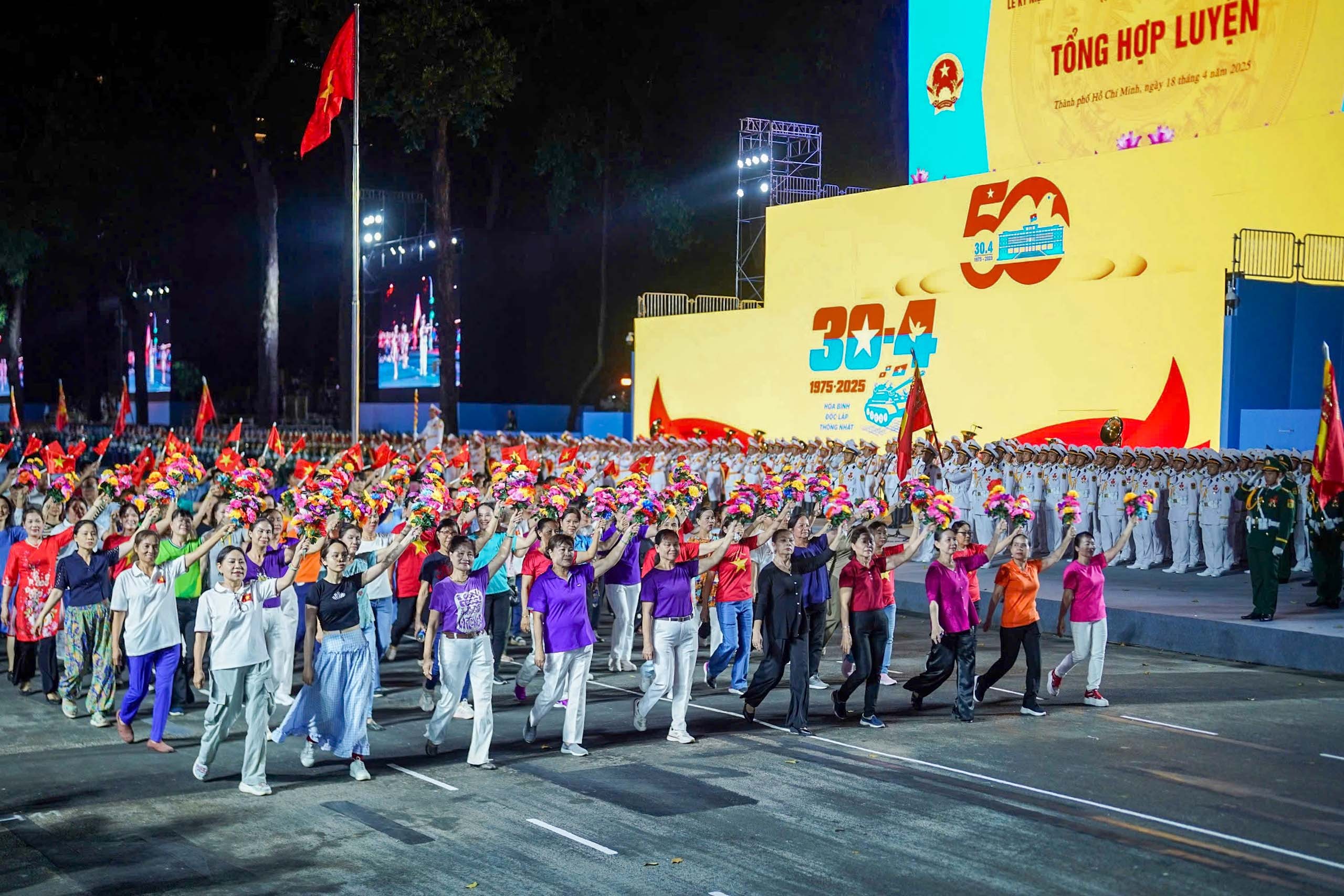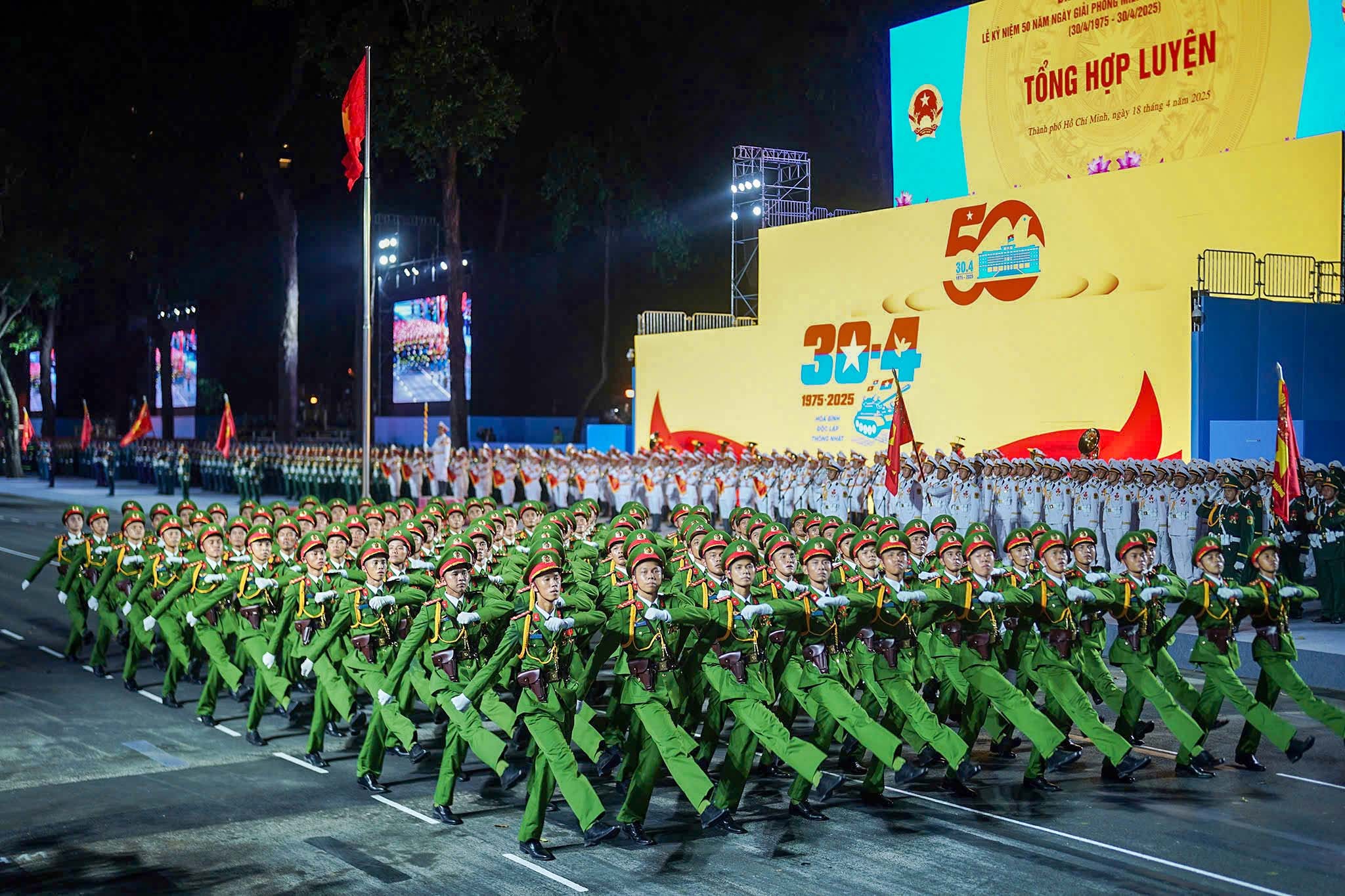 Từ 20h00 đến nửa đêm 18/4, hơn 13.000 người thuộc 38 khối diễu binh, diễu hành gồm lực lượng quân đội, công an, dân quân tự vệ đã có buổi luyện tập tổng hợp quy mô lớn trên tuyến đường Nguyễn Bỉnh Khiêm, Lê Duẩn, qua khu vực Hội trường Thống Nhất. Tất cả 25 khối thuộc lực lượng Quân đội, dân quân tự vệ và 13 khối của Bộ Công an sải bước đều bước chân tăm tắp, mạnh mẽ, thể hiện sự thống nhất trong tổ chức, sự đồng lòng trong ý chí, và sự chính quy, tinh nhuệ trong rèn luyện.