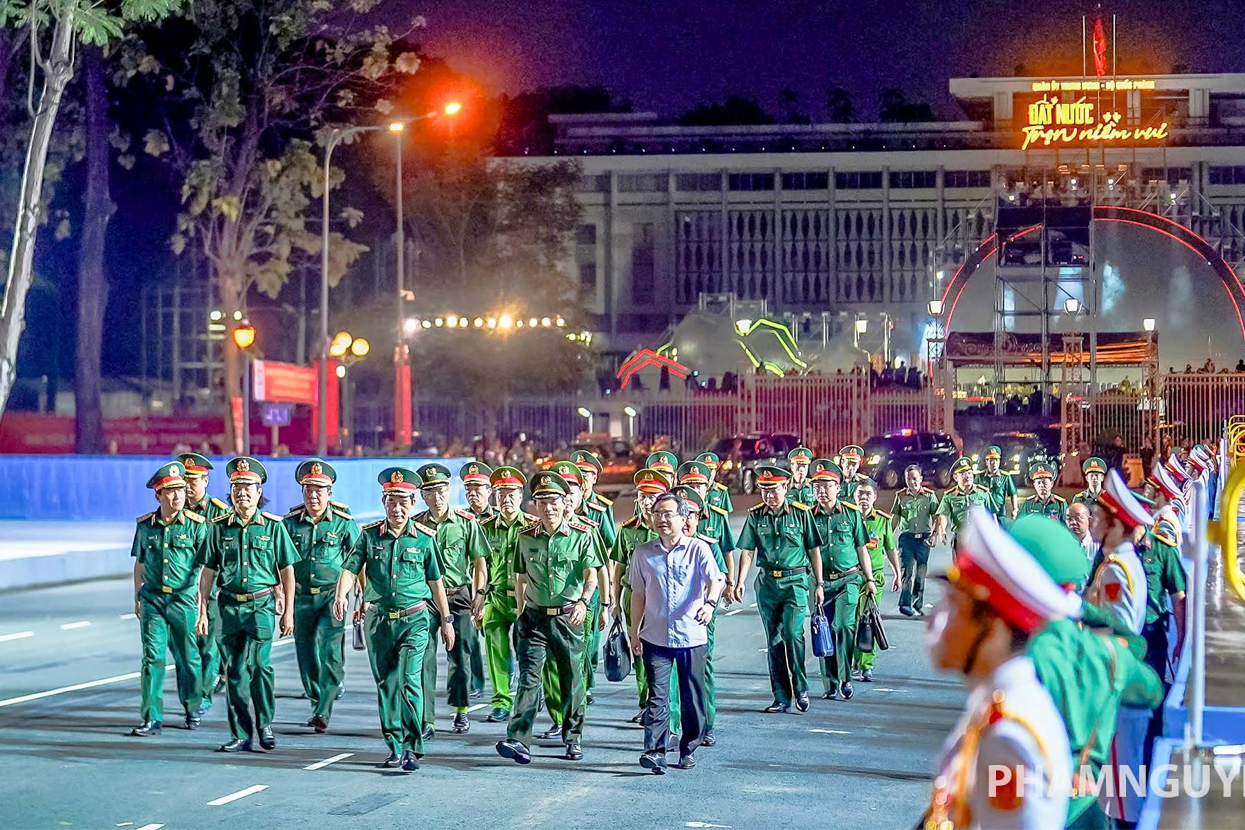 Đêm hợp luyện trọng thể càng trở nên ý nghĩa khi có sự hiện diện và chỉ đạo trực tiếp của các đồng chí lãnh đạo cấp cao. Đại tướng Phan Văn Giang – Bộ trưởng Bộ Quốc phòng, Đại tướng Lương Tam Quang – Bộ trưởng Bộ Công an đã trực tiếp kiểm tra công tác hợp luyện, thăm hỏi, động viên và tặng quà cho các lực lượng tham gia. Đồng chí Nguyễn Thanh Nghị – Phó Bí thư Thường trực Thành ủy TP.HCM cùng nhiều lãnh đạo thành phố cũng có mặt, thể hiện sự quan tâm sâu sắc, phối hợp chặt chẽ và sự vào cuộc đầy trách nhiệm của hệ thống chính trị. Điều này là nguồn động viên tinh thần to lớn cho các cán bộ, chiến sĩ đang ngày đêm tập luyện, là sự cam kết mạnh mẽ của Đảng, Nhà nước trong việc ghi nhớ công ơn và phát huy truyền thống của các lực lượng vũ trang trong sự nghiệp bảo vệ và xây dựng đất nước.