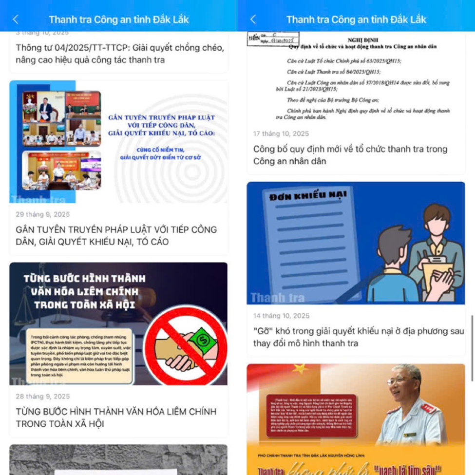 Nhằm phù hợp điều kiện thực tiễn sau khi sáp nhập địa giới hành chính và trước yêu cầu nâng cao chất lượng phục vụ của lực lượng Công an, Thanh tra Công an tỉnh đã tham mưu Giám đốc Công an tỉnh đổi số đường dây nóng tiếp nhận tố cáo tiêu cực của cán bộ, chiến sĩ sang số 0789.558899 để người dân dễ ghi nhớ và thuận tiện trong liên lạc. Tháng 8/2025, hai trang mạng xã hội chính thức mang tên “Thanh tra Công an tỉnh Đắk Lắk” trên Facebook và Zalo OA được thành lập, trở thành cầu nối trực tuyến giữa người dân và cơ quan Công an trong nhiều tình huống mà việc đến trực tiếp trụ sở gặp khó khăn. Công tác quản trị hai trang được tổ chức bài bản, do Ban Biên tập gồm những cán bộ am hiểu nghiệp vụ, thành thạo công nghệ và nắm vững yêu cầu bảo vệ bí mật Nhà nước. Việc vận hành được kiểm soát chặt chẽ, tuân thủ nghiêm ngặt các quy định về an ninh mạng, đảm bảo hoàn toàn không để xảy ra lộ lọt thông tin hay sự cố quản lý tài khoản.