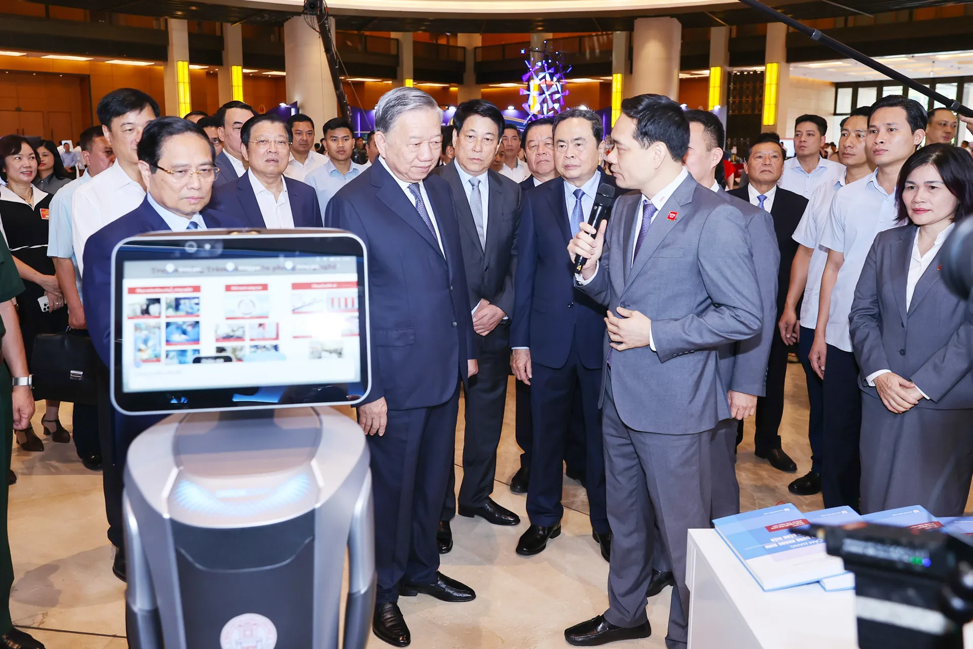 Tổng Bí thư Tô Lâm cùng các đồng chí lãnh đạo Đảng, Nhà nước và các đại biểu tham quan triển lãm những thành tựu nổi bật của ngành y tế tại điểm cầu chính Nhà Quốc hội sáng 16/9. Ảnh: VGP/Nhật Bắc
