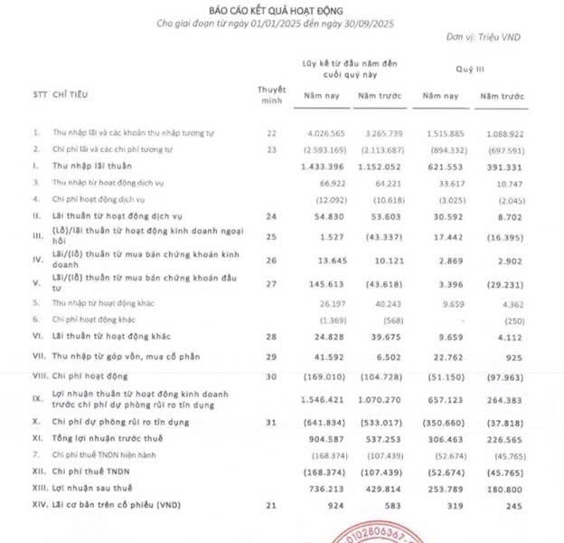 Đóng góp vào lợi nhuận trước thuế, đáng chú ý là lãi thuần từ hoạt động đầu tư chứng khoán 9 tháng năm 2025 đạt 145,6 tỷ đồng so với âm 43,6 tỷ đồng cùng kỳ năm trước, phản ánh hiệu quả từ chiến lược đầu tư an toàn và ưu tiên kiểm soát rủi ro. Đồng thời, thu nhập từ hoạt động góp vốn, mua cổ phần quý III năm 2025 đạt 41,59 tỷ đồng, gấp 6 lần so với cùng kỳ năm 2024.