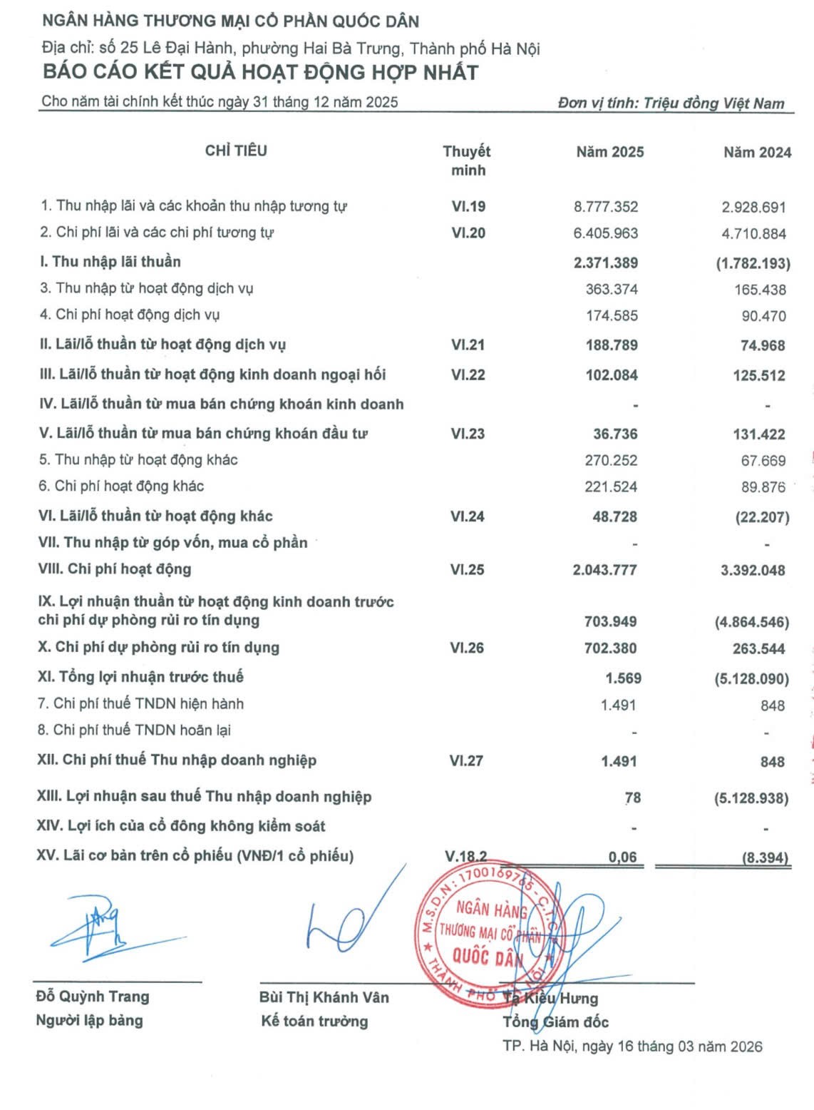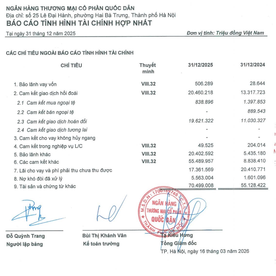Báo cáo tài chính của NCB ghi nhận: Nợ có khả năng mất vốn tính đến ngày 31/12/2025 của NCB là 13.187.712 triệu đồng.