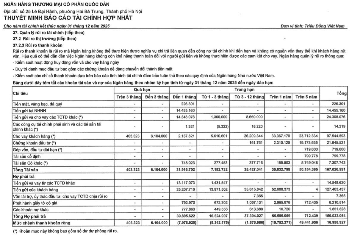 Bảng dưới đây tóm tắt các khoản tài sản và nợ của Ngân hàng theo nhóm kỳ hạn tính từ ngày 31/12/2025 đến ngày đáo hạn.