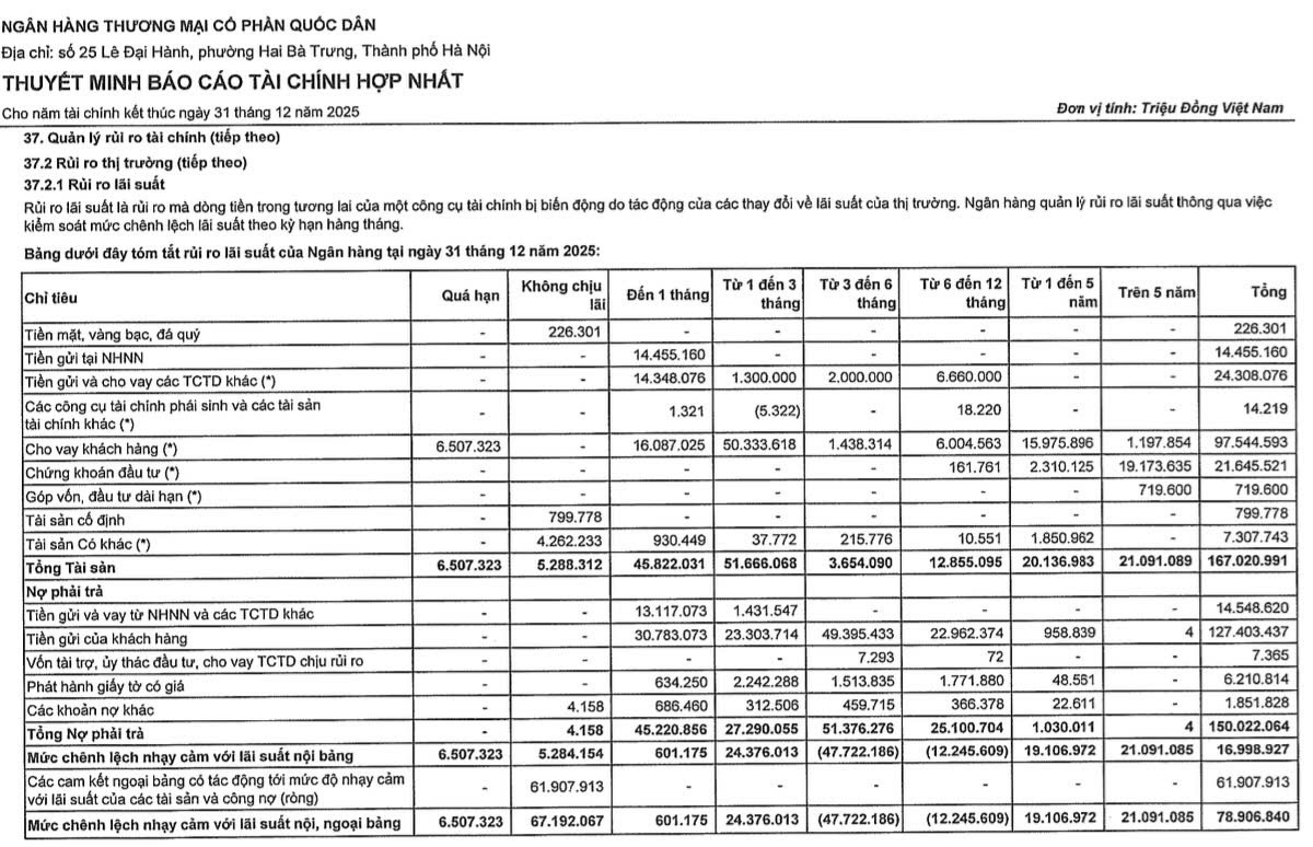 Bảng dưới đây tóm tắt rủi ro lãi suất của NCB tại ngày 31/12/2025.
