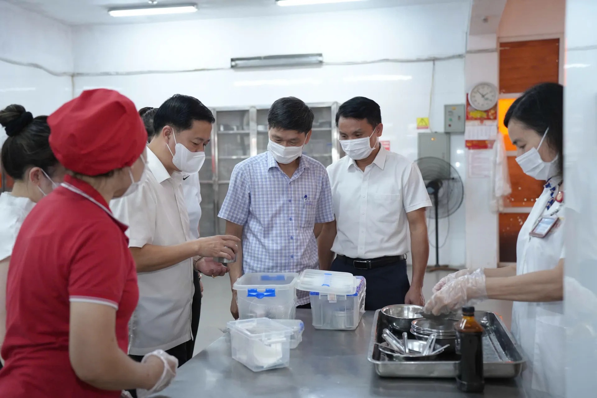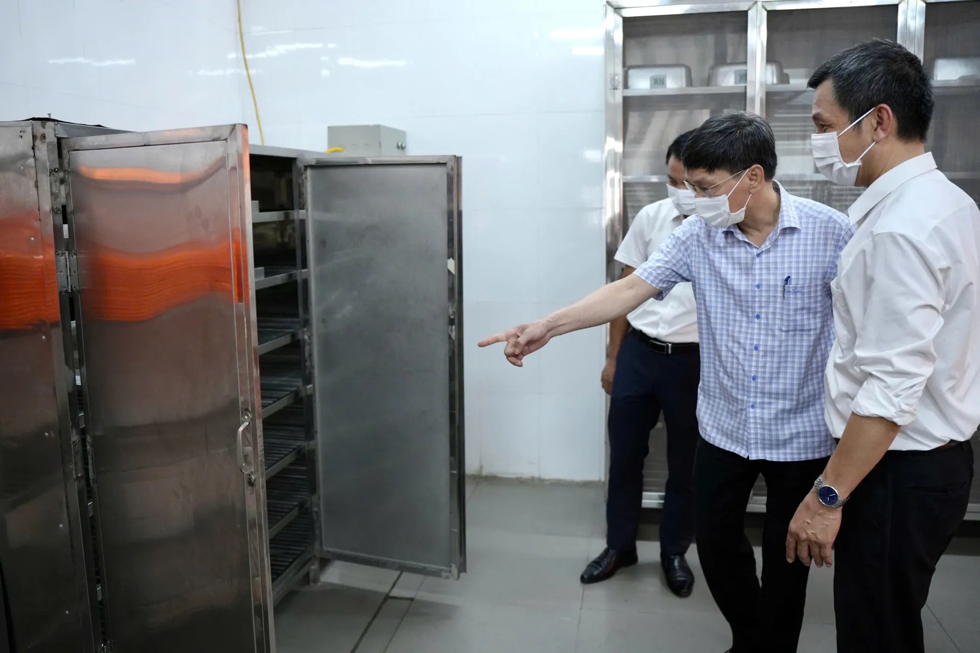 Phó Giám đốc Sở Y tế Hà Nội Vũ Cao Cương kiểm tra tủ sấy bát đĩa.