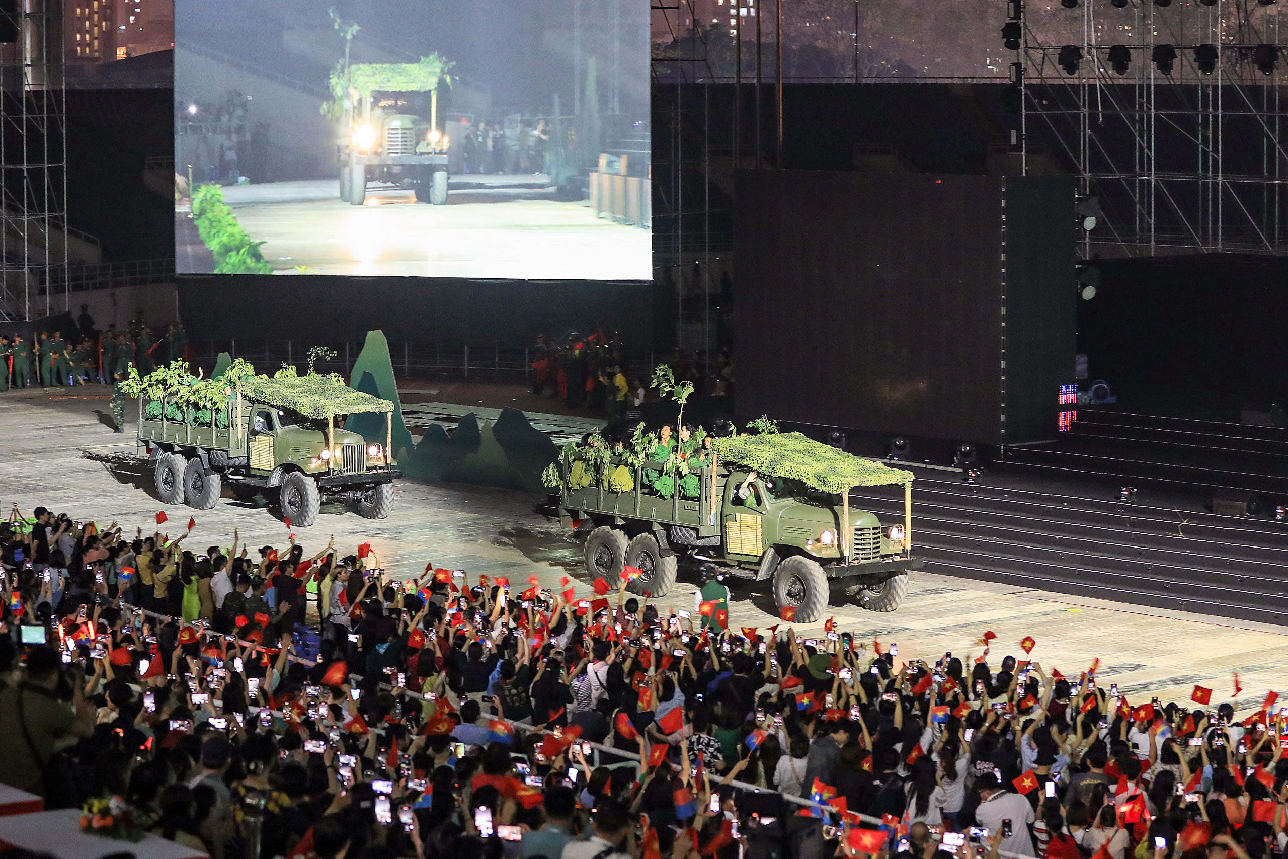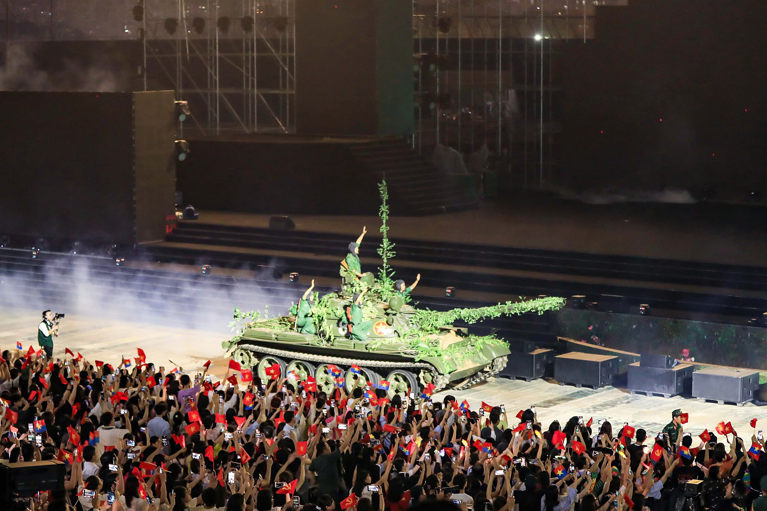 Lần đầu tiên trong một chương trình chính luận, xe tăng, biểu tượng chiến thắng xuất hiện trực tiếp trên sân vận động