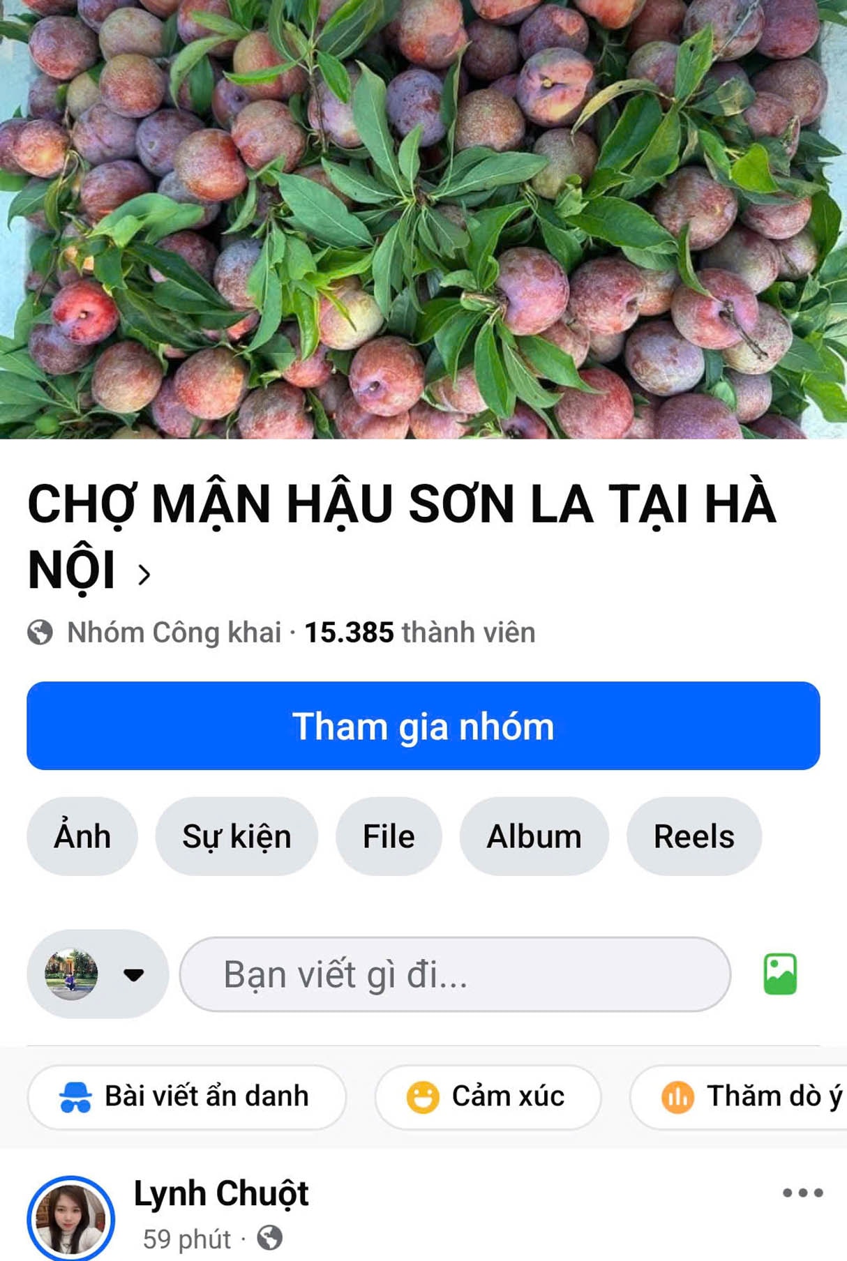 Nhóm mua bán mận hậu Sơn La trên mạng xã hội Facebook. Ảnh: Hoài Nam