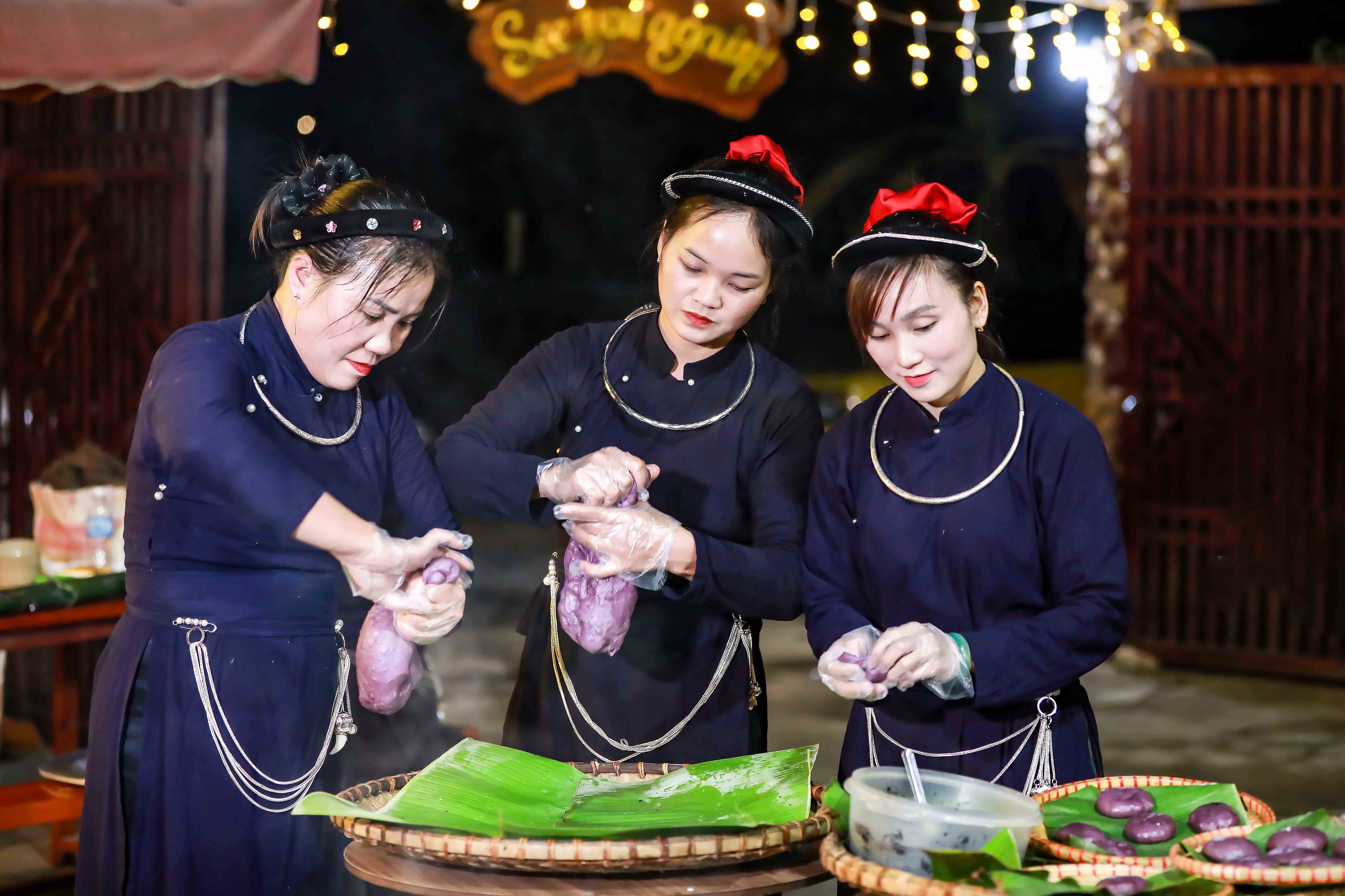 Các cô gái Tày làm bánh dày lá cẩm cho du khách thưởng thức