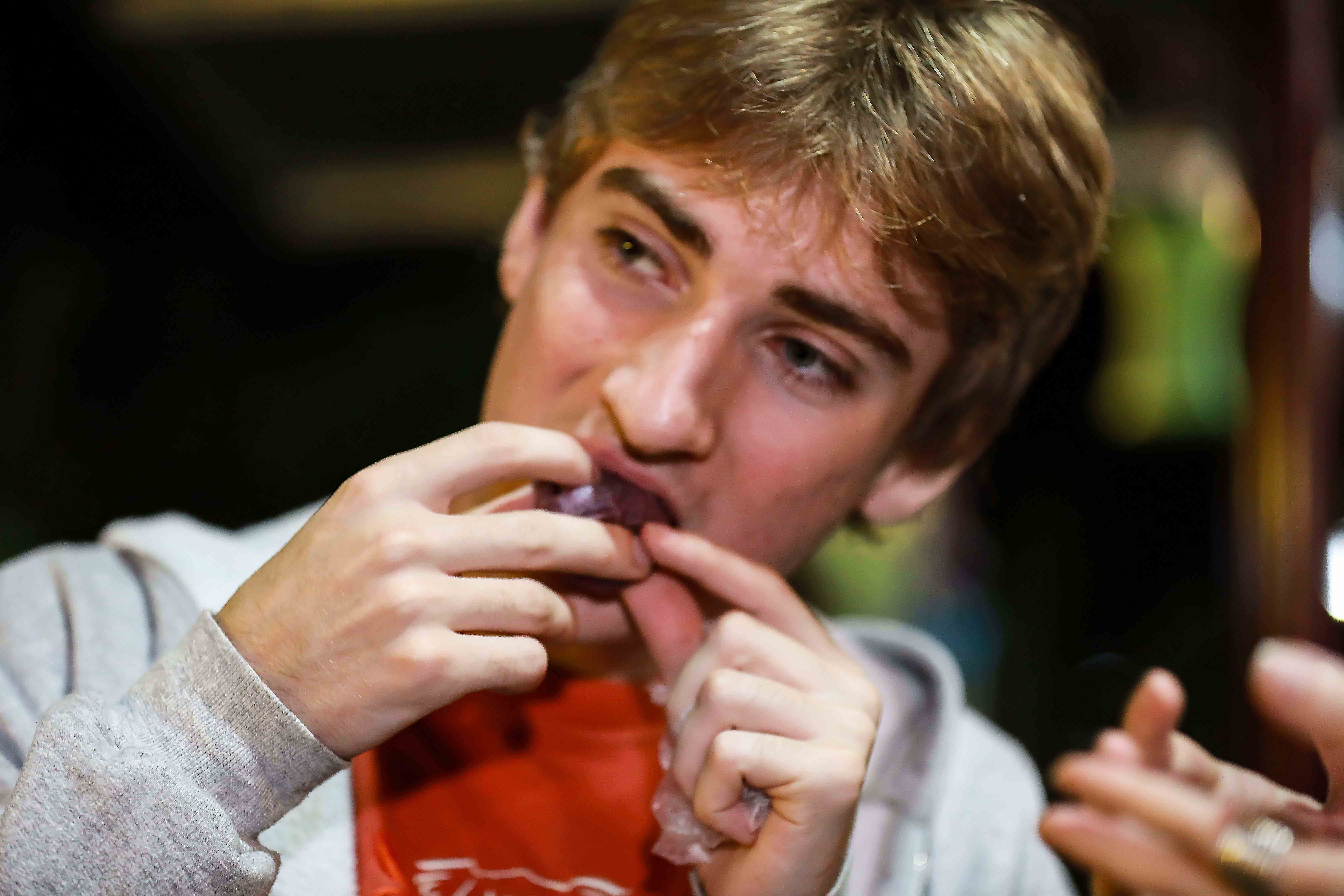 Du khách nước ngoài thưởng thức bánh dày lá cẩm do chính anh ta trải nghiệm