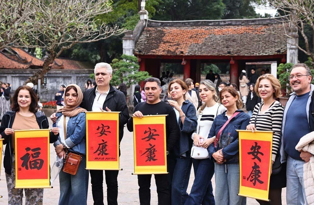 Du khách quốc tế phấn khởi tìm hiểu nét đẹp xin chữ của Việt Nam trong đầu năm mới tại di tích Văn Miếu - Quốc Tử Giám.