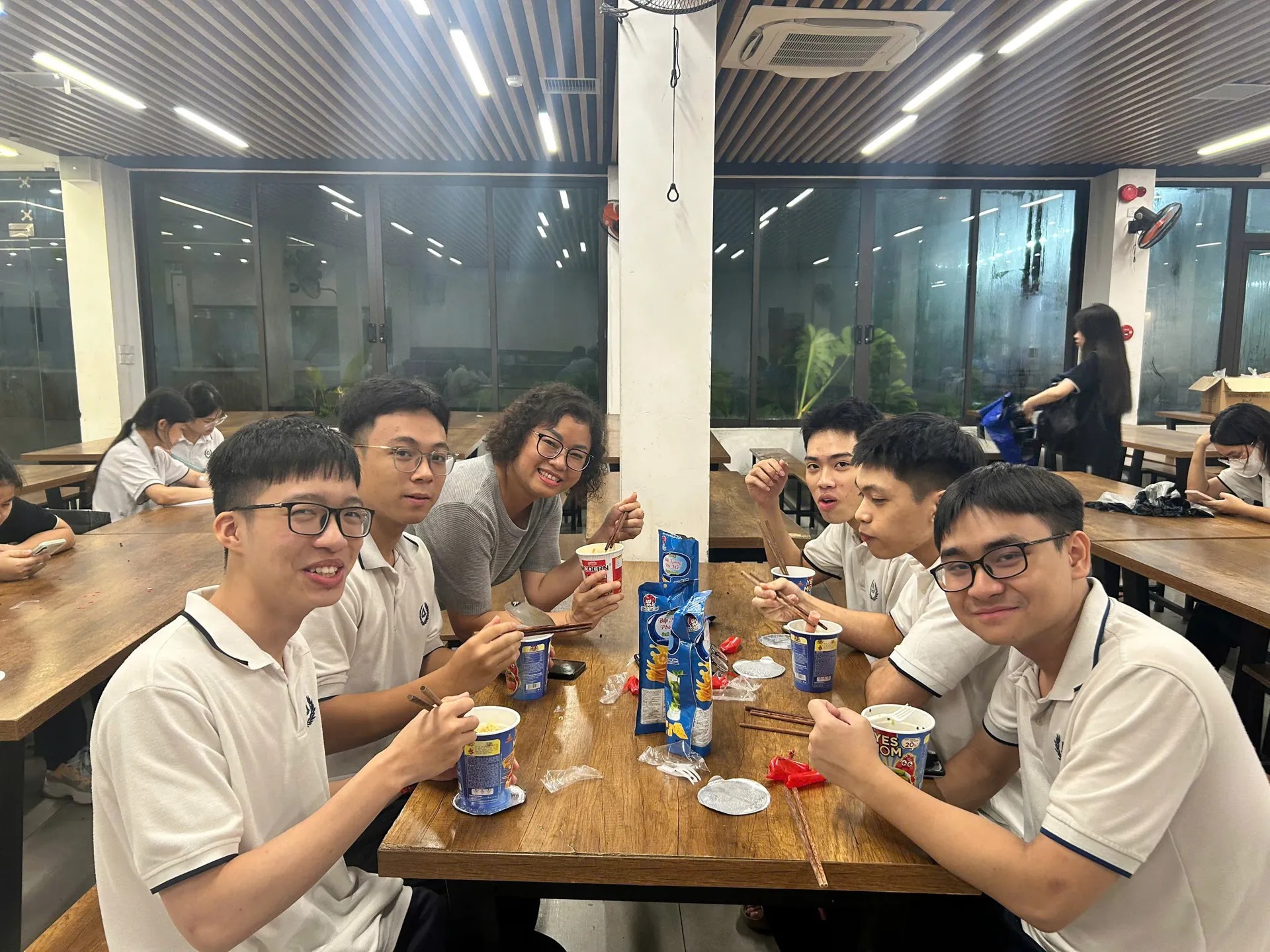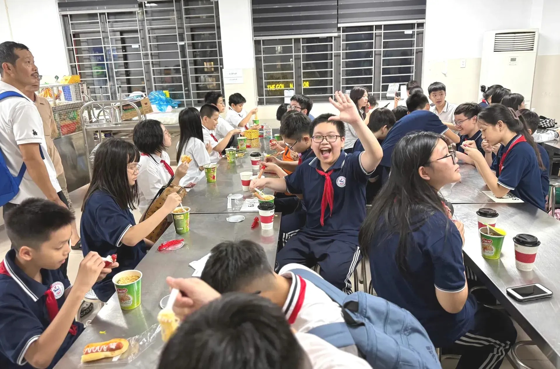 Học sinh Hệ thống Giáo dục Marie Curie với bữa ăn tối tại trường ngày mưa bão.