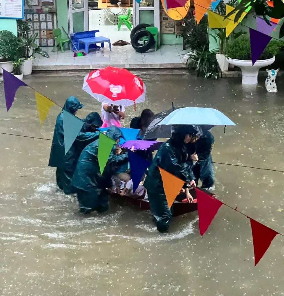 Do khu vực sân ngập sâu, tại Trường Mầm non Yên Hoà, giáo viên và dân quân tự vệ phối hợp, dùng phương tiện đưa trẻ ra khu vực cổng để bố mẹ nhanh chóng đón được con.