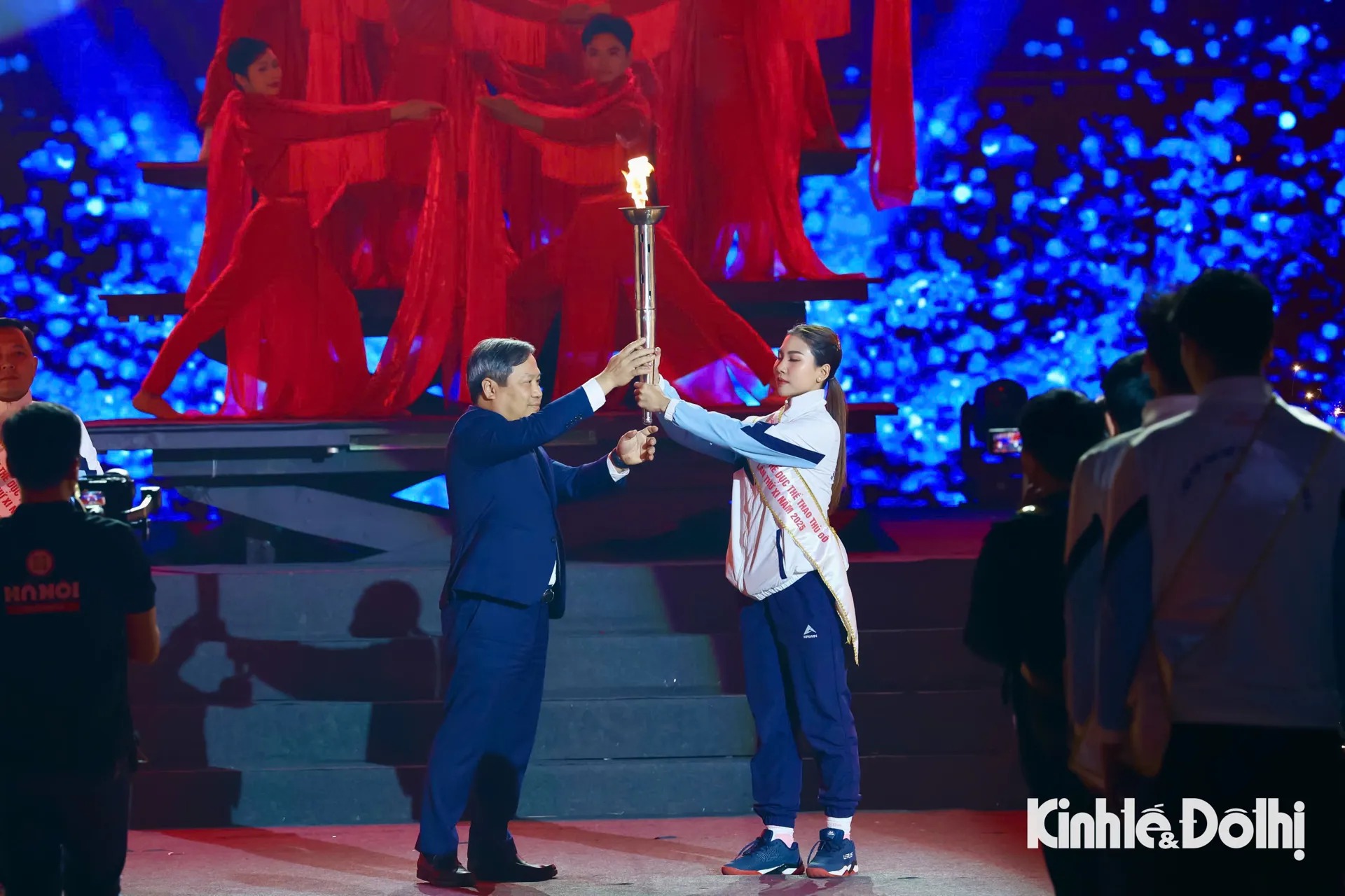 Ủy viên T.Ư Đảng, Phó Bí thư Thành ủy, Chủ tịch UBND TP Hà Nội Vũ Đại Thắng trao ngọn đuốc Đại hội cho đại diện vận động viên tiêu biểu của Hà Nội.