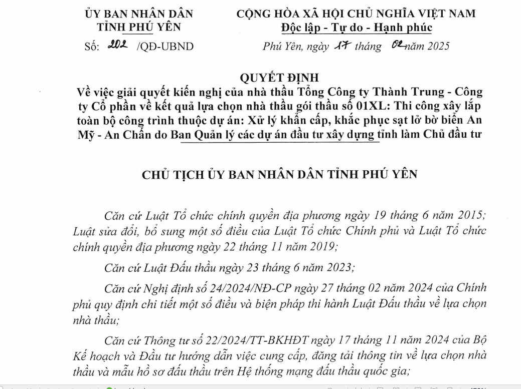 Tiếp đến, ngày 17/02/2025, Phó Chủ tịch UBND tỉnh Phú Yên Lê Tấn Hổ ký Quyết định số 202/QĐ-UBND, trong quyết định nêu rõ: Quyết định kết quả giải quyết kiến nghị của nhà thầu Tổng Công ty Thành Trung- Công ty cổ phần về kết quả lựa chọn nhà thầu gói thầu số 01XL: Thi công xây lắp toàn bộ công trình thuộc dự án: Xử lý khẩn cấp, khắc phụ sạt lở bờ biển An Mỹ- An Chấn do Ban quản lý các dự án Đầu tư xây dựng tỉnh Phú Yên làm chủ đầu tư như sau:
