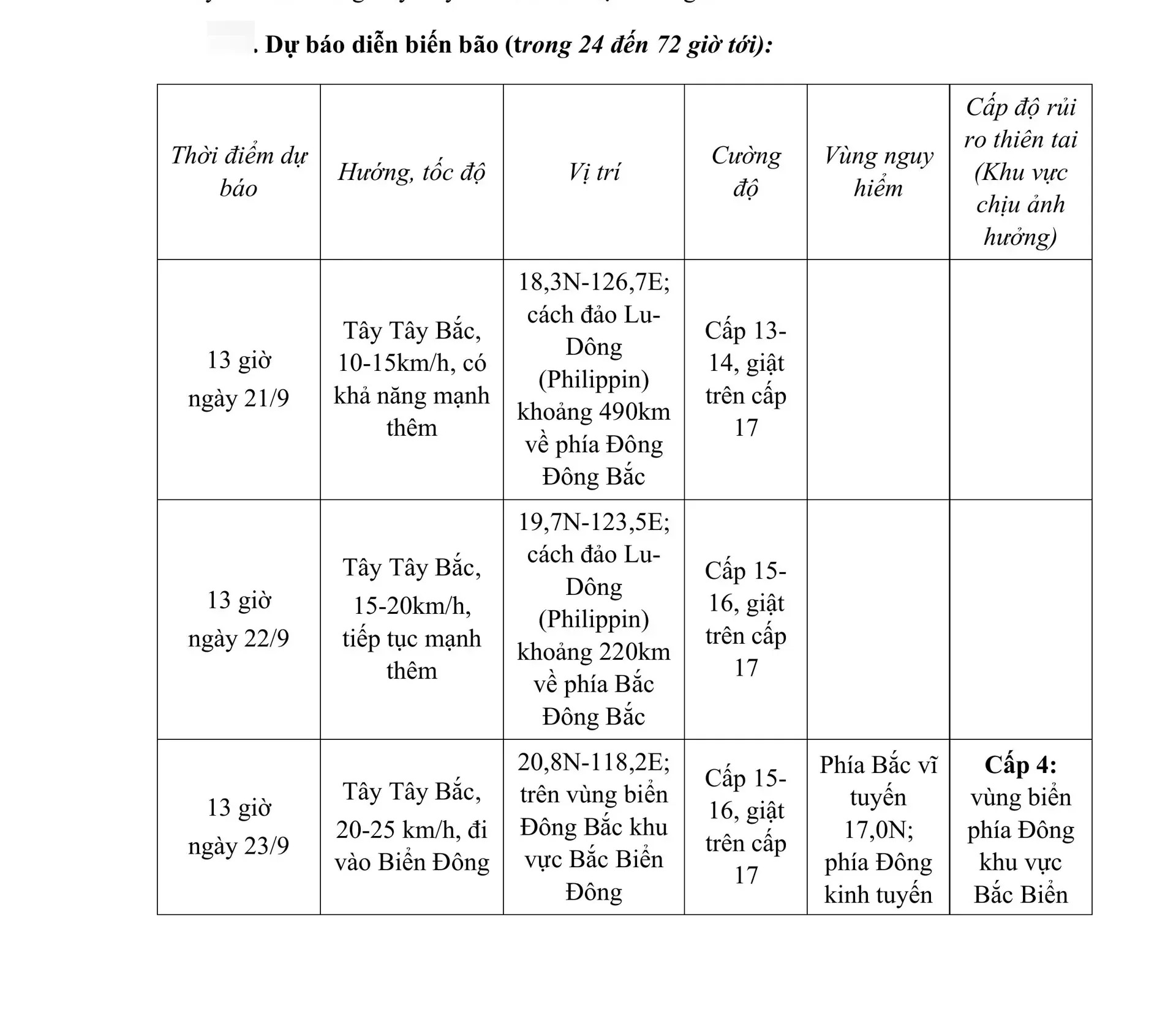 Cơ quan khí tượng thủy văn nhận định khoảng ngày 23/9, bão tiếp tục mạnh lên cấp 15-16, giật trên cấp 17 và có khả năng đi vào Biển Đông, trở thành cơn bão số 9 của nước ta trong năm nay. Từ 72 đến 120 giờ tiếp theo, bão di chuyển chủ yếu theo hướng Tây, mỗi giờ đi được khoảng 20km, cường độ suy yếu dần.