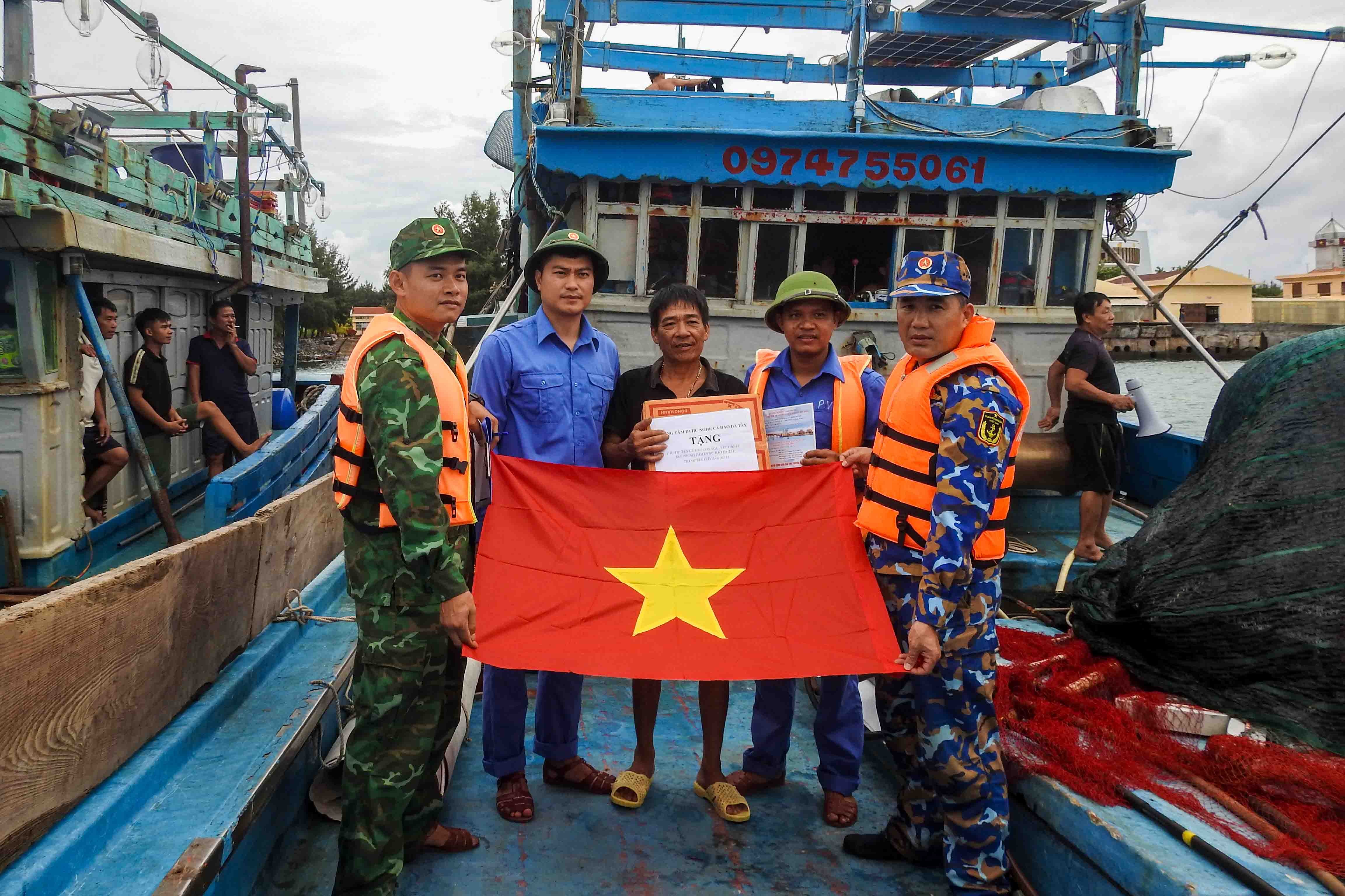 Cán bộ, chiến sĩ đảo Đá Tây thăm hỏi tặng cờ cho ngư dân vào tránh trú bão