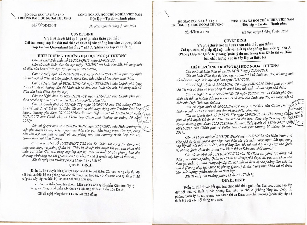 Theo thống kê của phóng viên, Công ty Cổ phần kiến trúc Tỷ Lệ Vàng đã trúng thầu tổng cộng 14 gói thầu tại trường Đại học Ngoại Thương. Các Quyết định phê duyệt KQLCNT đều do PGS TS Bùi Anh Tuấn, Hiệu trường nhà trường ký.