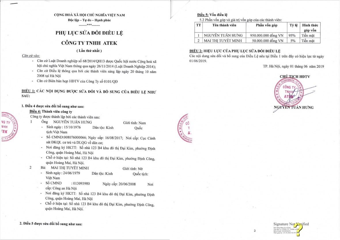 Cũng trong năm 2019, điều lệ công ty được thay đổi, tỉ lệ thành viên góp vốn gồm có bà Mai Thị Tuyết Minh góp 5% và ông Nguyễn Tuấn Hưng góp 95%. Đặc biệt, ông Hưng và bà Minh đều có cùng mã hộ khẩu và cùng một địa chỉ đăng ký thường trú.