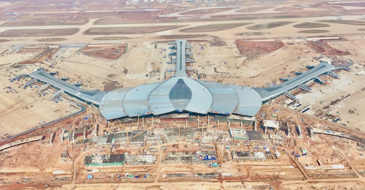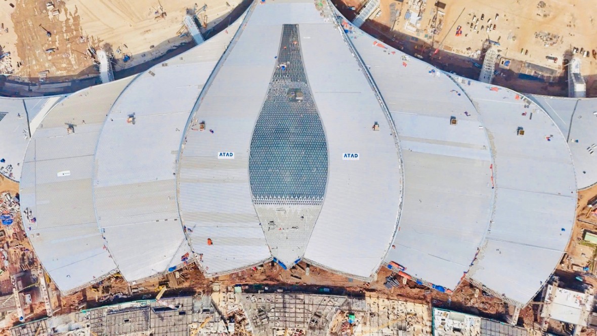 Từ xa nhìn lại, nhà ga hành khách sân bay Long Thành nổi bật giữa đại công trường với hình dáng hoa sen cách điệu đang bung nở. Sau hơn hai năm khởi công (từ năm 2023), mái che cánh sen đã hoàn tất, hệ khung kết cấu đồ sộ đã hiện hữu trọn vẹn.