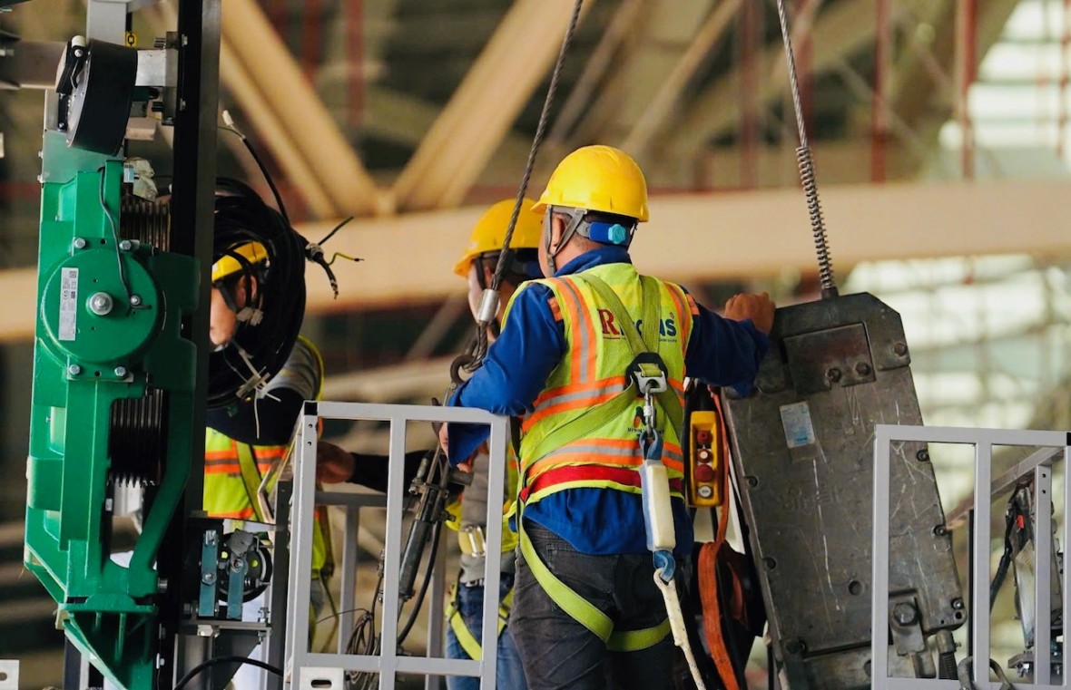 Từ trệt lên các tầng cao, hàng ngàn công nhân trong áo bảo hộ phản quang di chuyển liên tục, mỗi tổ đội một nhiệm vụ, không ai đứng yên.
