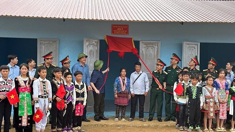 Lãnh đạo Quân khu 2, tỉnh Điện Biên cùng cán bộ, nhân dân chứng kiến lễ khánh thành nhà mới tại bản Háng Pù Xi. (Ảnh: Đức Hạnh)