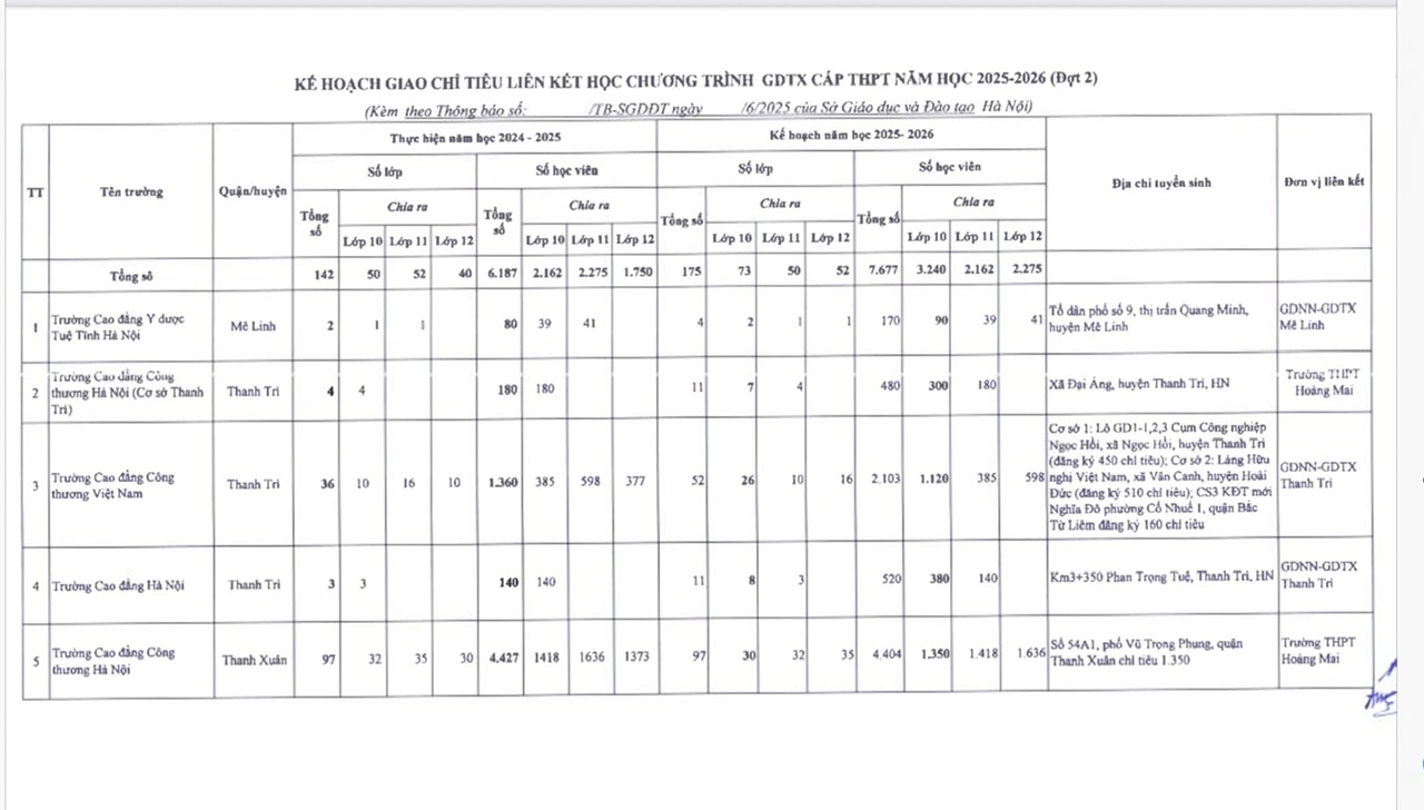 Thông tin từ Sở Giáo dục và Đào tạo Hà Nội cho biết, Sở vừa ban hành quyết định về việc giao chỉ tiêu học văn hóa chương trình giáo dục thường xuyên cấp trung học phổ thông cho các trường trung cấp, cao đẳng trên địa bàn thành phố năm học 2025-2026 đợt 2.