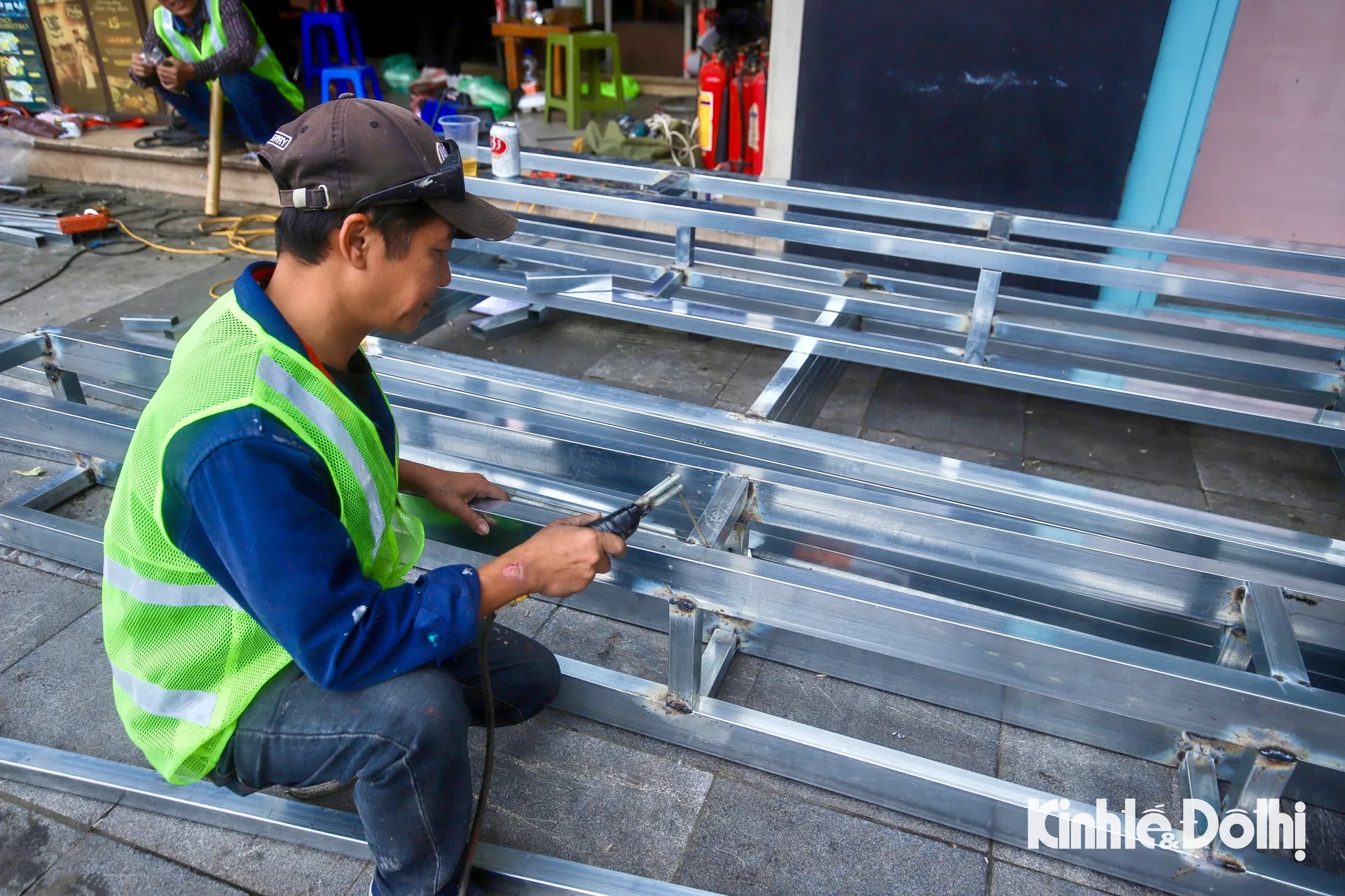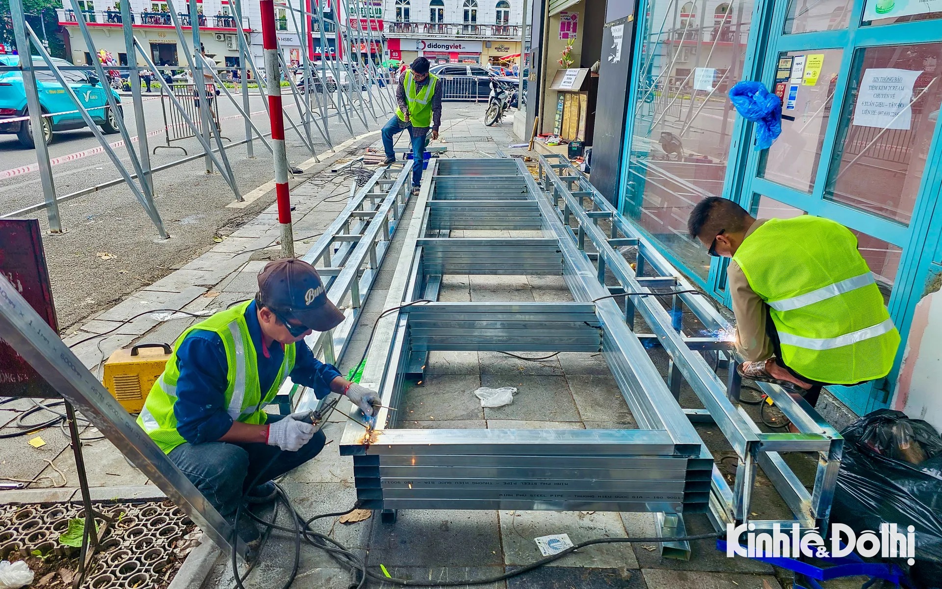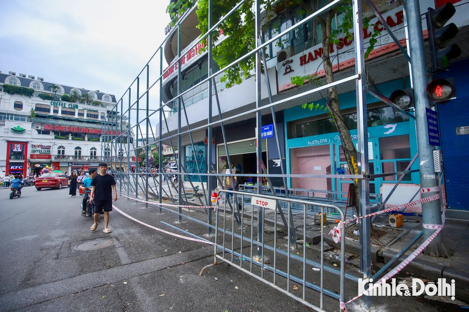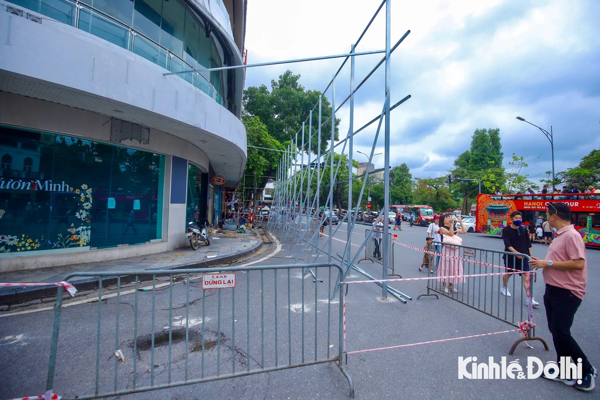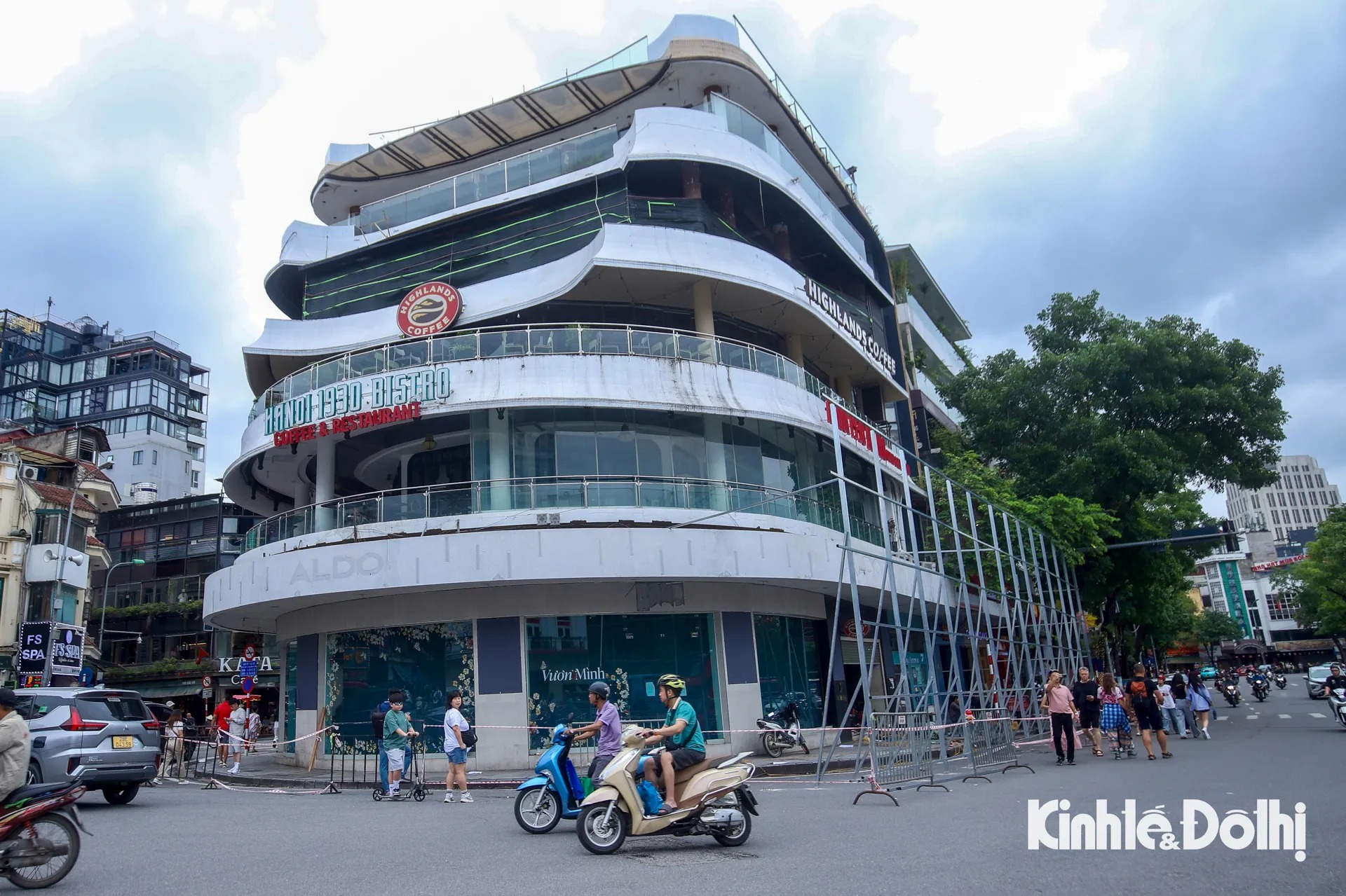 Kinhte&Xahoi Ngày 25/5, các công nhân đang tiến hành dựng khung rào chắn tòa nhà “Hàm Cá Mập” (số 7 Đinh Tiên Hoàng, quận Hoàn Kiếm, Hà Nội) để chuẩn bị phá dỡ tòa nhà.