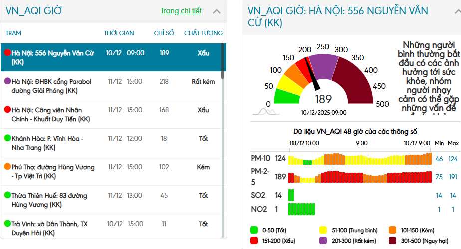 Số liệu do Trung tâm Quan trắc môi trường (Cục Môi trường, Bộ Nông nghiệp và Môi trường) công bố trên trang CEM.GOV.VN lúc 16h cho thấy, chất lượng không khí tại 3 khu vực đặt trạm quan trắc không khí đều ở mức xấu và rất xấu. Cụ thể, khu vực ô nhiễm cao nhất là Đại học Bách khoa Hà Nội (phía đường Giải Phóng), chỉ số chất lượng không khí (AQI) ở ngưỡng 218 (rất xấu); khu vực số 556 Nguyễn Văn Cừ (phường Long Biên) ở ngưỡng là 189 (mức xấu) và khu vực Công viên Nhân Chính là 168 (mức xấu). Theo khuyến cáo, chất lượng không khí ở ngưỡng xấu và rất xấu ảnh hưởng đến sức khỏe người dân. Người dân khi ra đường được khuyến cáo đeo khẩu trang đạt chuẩn để chống bụi mịn xâm nhập vào cơ thể gây ra một số bệnh về hô hấp.