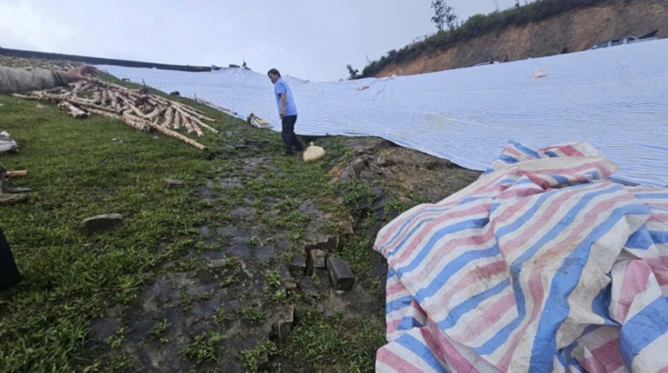 Theo ghi nhận tại hiện trường, khu vực vai trái đập chính vẫn đang được phủ bạt và gia cố bằng bao cát, song nước mưa tiếp tục tràn xuống.