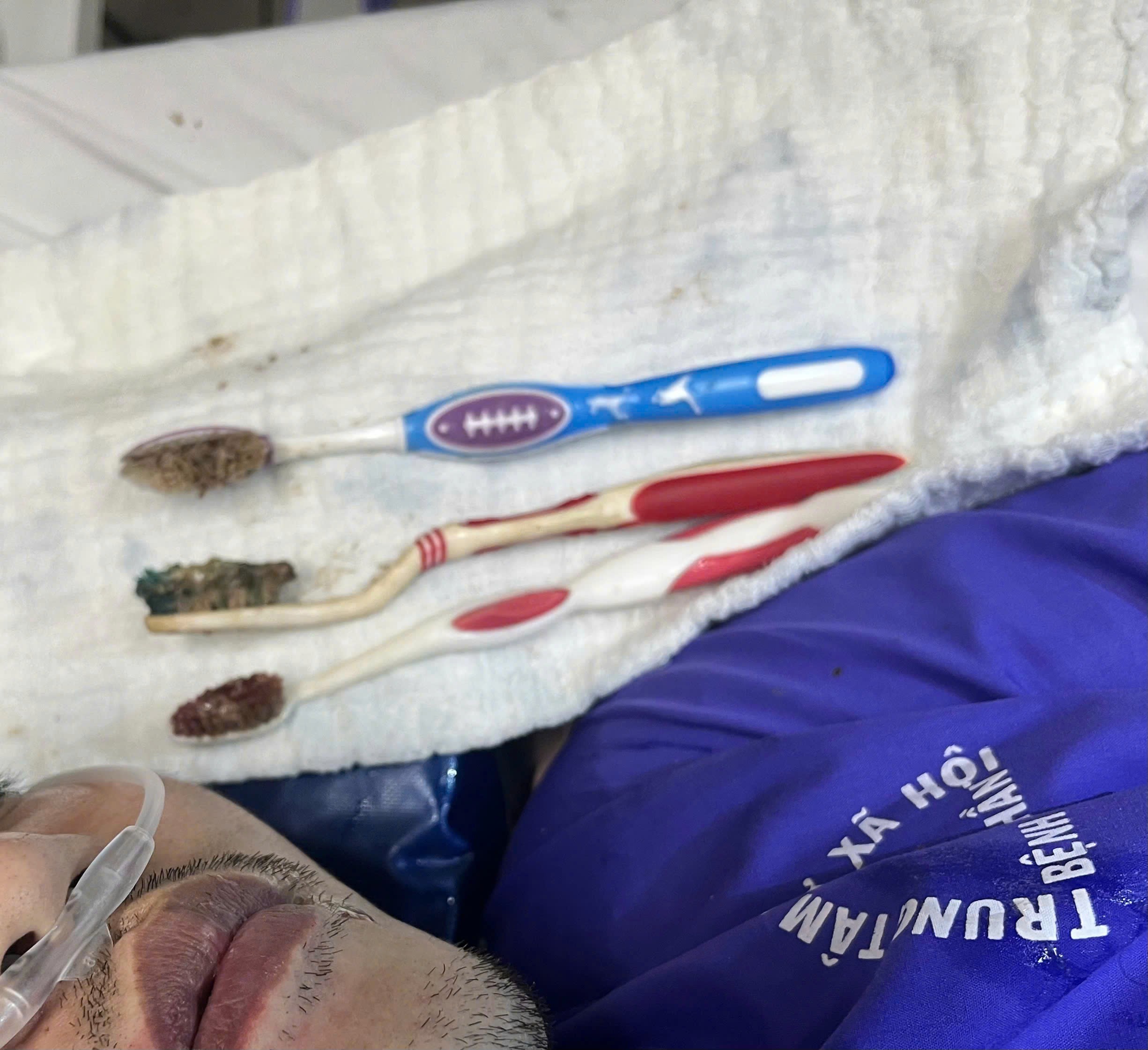 3 bàn chải đánh răng, mỗi cái dài gần 20cm, được lấy ra từ đường tiêu hóa của nam thanh niên.