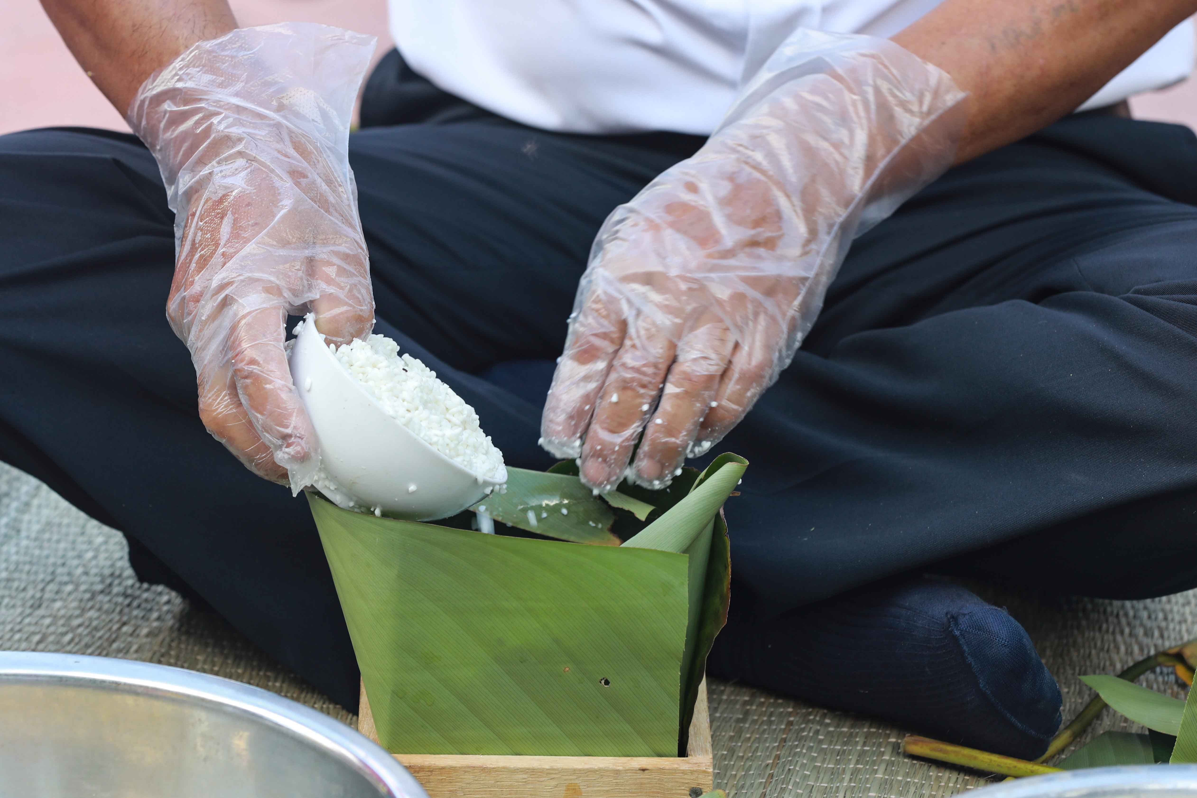 Gạo nếp đổ vào lòng lá, trắng và thơm