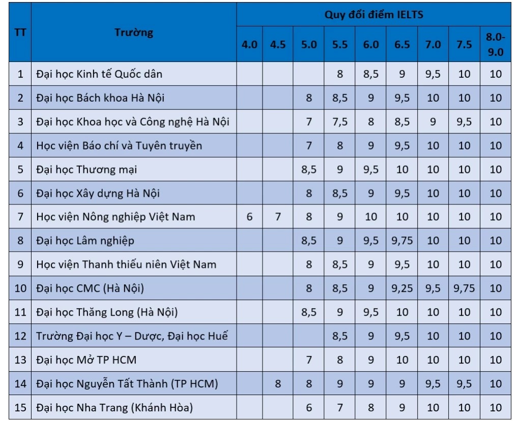 Phần lớn các trường còn lại yêu cầu IELTS từ 5.0 trở lên. Ở mức này, điểm quy đổi thường nằm trong khoảng 6–8 điểm, tùy từng bậc và từng trường. Với IELTS 7.0, nhiều trường chấp nhận quy đổi thẳng lên 10 điểm, như Đại học Bách khoa Hà Nội, Đại học Xây dựng Hà Nội, Trường Đại học Y Dược - Đại học Huế và Học viện Báo chí và Tuyên truyền. Điều này cho thấy nhiều trường đang xem IELTS như một thước đo đủ tin cậy để đánh giá năng lực ngoại ngữ ở mức cao.