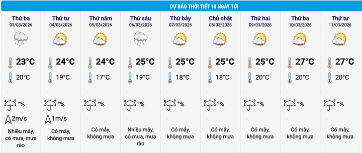 Từ ngày 3/3, khi không khí lạnh ảnh hưởng rõ rệt, Hà Nội có mưa, mưa rào, trời nhiều mây; nhiệt độ cao nhất trong ngày giảm khoảng 5–7°C, còn khoảng 23°C, thấp nhất 20°C.