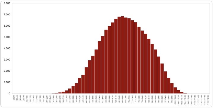 Theo thống kê của hội đồng thi, phổ điểm năm nay có dạng gần phân bố chuẩn, với điểm trung bình và trung vị đều ở mức 682. Thí sinh đạt điểm cao nhất là 1.098/1.200.