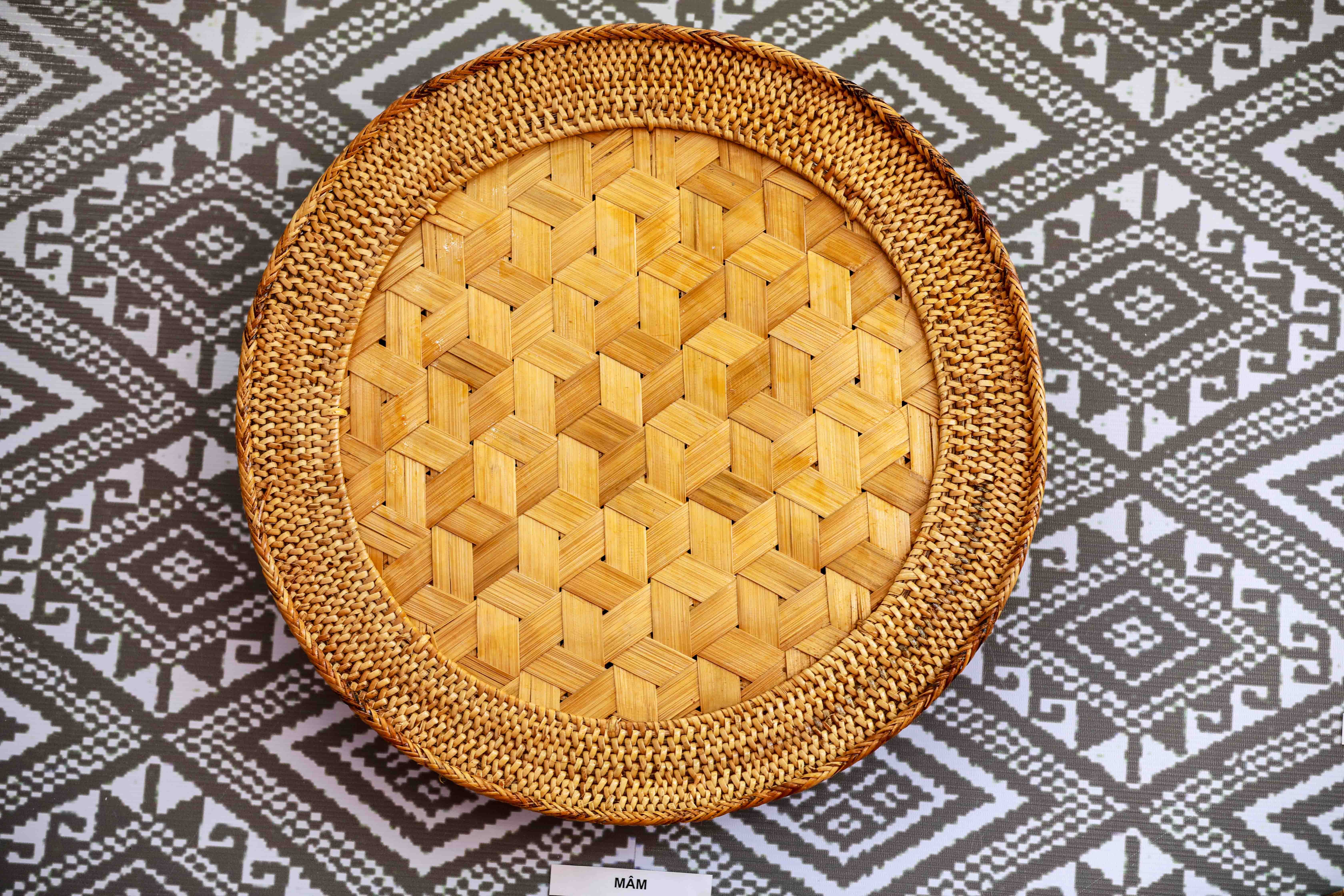 Người thợ trình diễn cách đan mâm hè vật phẩm chỉ dùng trong lễ cúng quan trọng. Hai mặt đều đẹp, nan đều tăm tắp; kỹ thuật đòi hỏi hàng chục năm rèn luyện mới đạt đến sự hoàn hảo