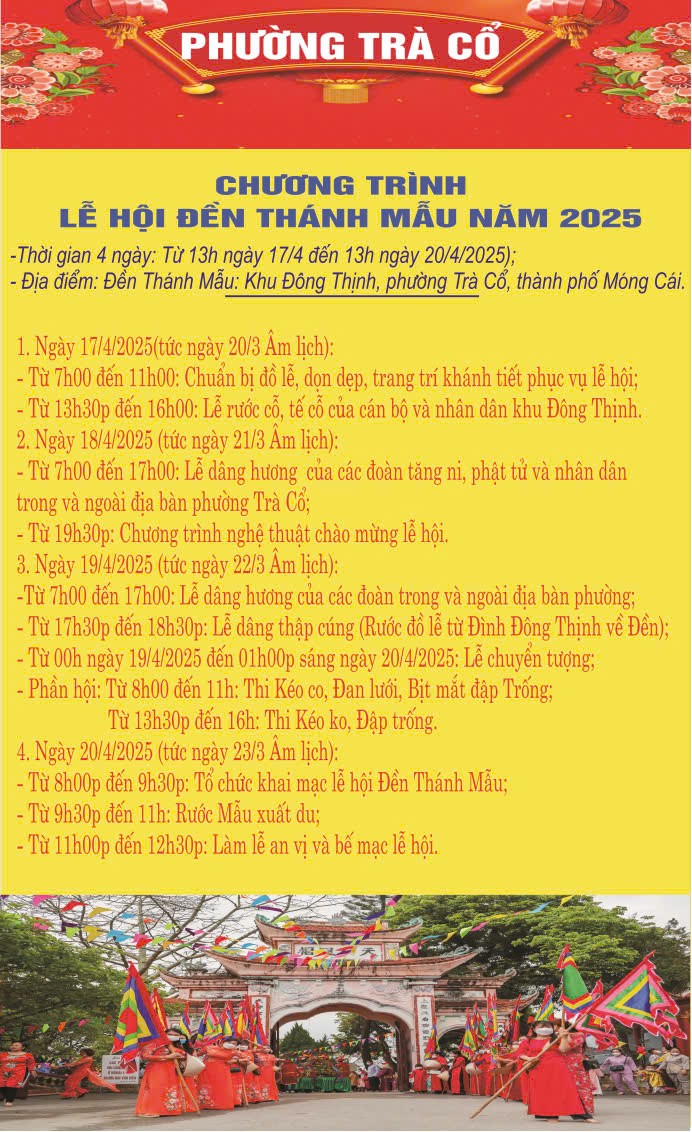 Năm nay, lễ hội đền Thánh Mẫu phường Trà Cổ diễn ra trong 4 ngày, từ 13h ngày 17/4 đến 13h ngày 20/4/2025 với phần lễ và phần hội. Theo đó sẽ có Lễ rước cỗ, tế cỗ của nhân dân và cán bộ Khu Đông Thịnh, Lễ dâng hương của các đoàn tăng ni, phật tử và nhân dân trong và ngoài địa bàn phường; Lễ dâng thập cúng; Lễ chuyển tượng.