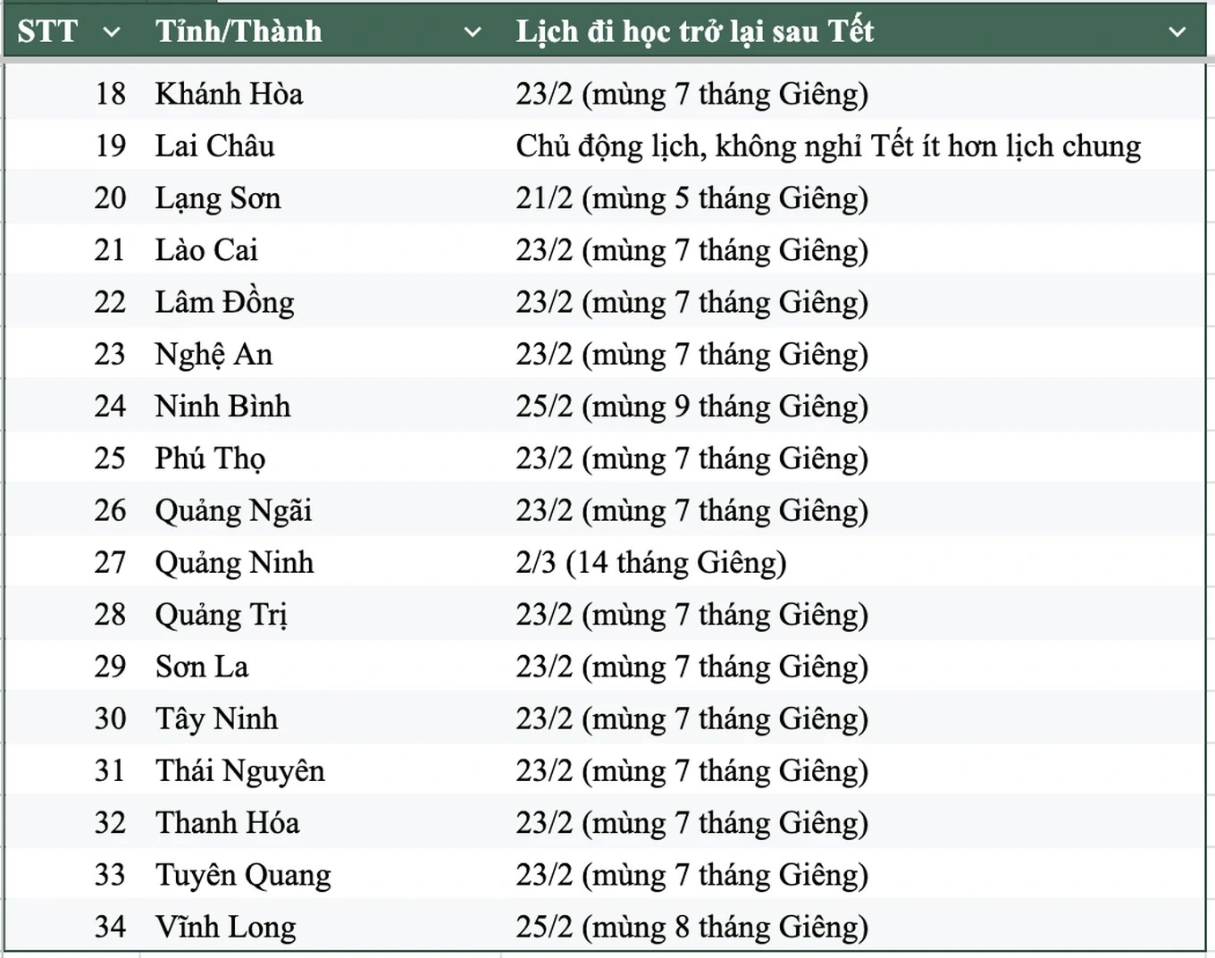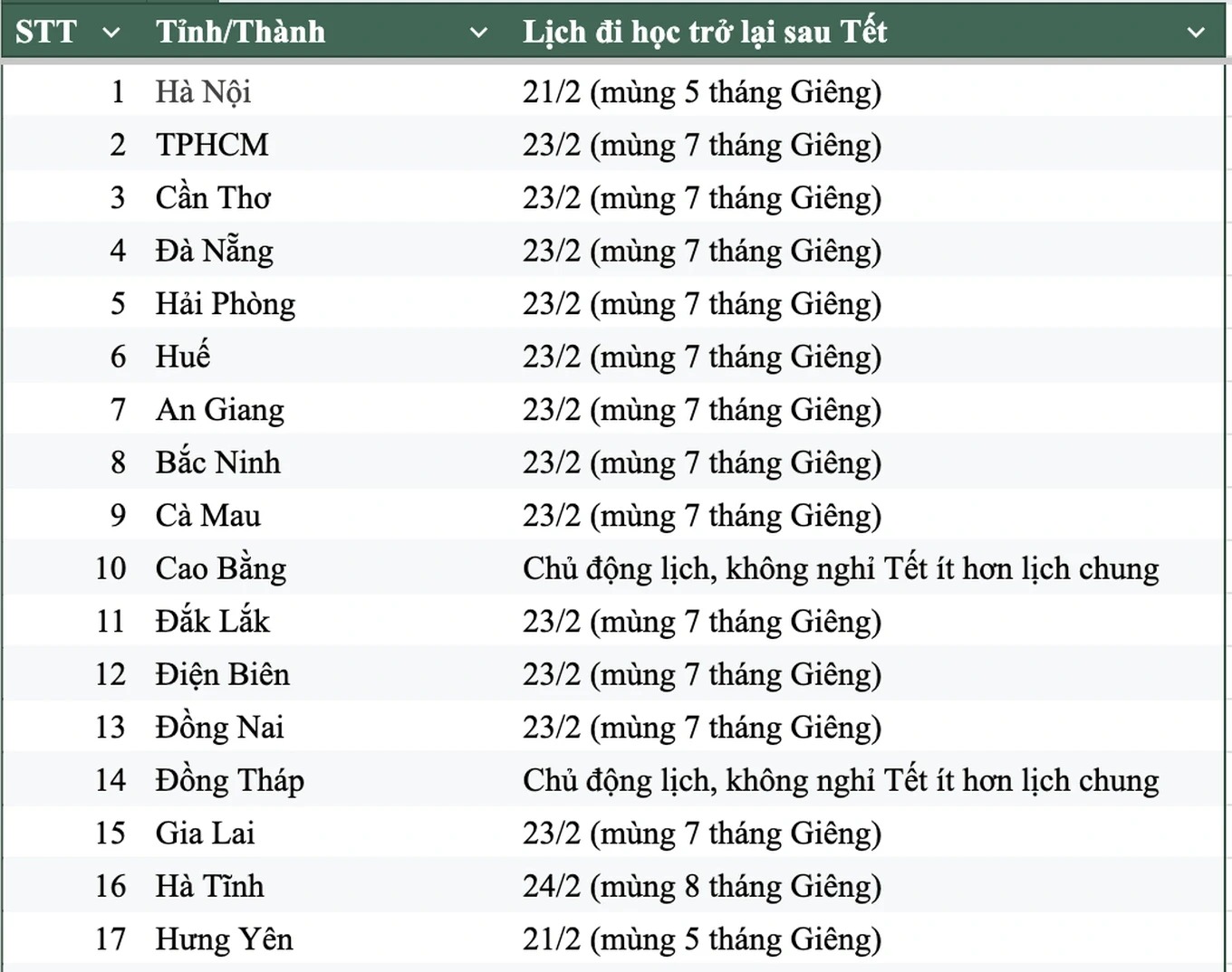 Đáng chú ý, Cao Bằng, Đồng Tháp và Lai Châu không ấn định cứng ngày đi học trở lại ở cấp tỉnh. Thay vào đó, các trường được chủ động sắp xếp lịch cụ thể, miễn sao bảo đảm khung thời gian nghỉ không thấp hơn quy định chung.