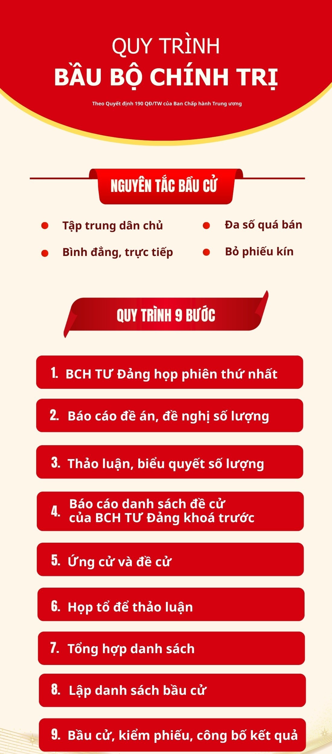 Ủy viên Bộ Chính trị, Ban Bí thư phải là ủy viên Trung ương Đảng (chính thức) trọn 1 nhiệm kỳ trở lên; đã kinh qua và hoàn thành tốt nhiệm vụ ở các chức vụ lãnh đạo chủ chốt cấp tỉnh (bí thư; chủ tịch HĐND, chủ tịch UBND) hoặc trưởng các ban, bộ, ngành, MTTQ, tổ chức chính trị - xã hội ở Trung ương và tương đương.