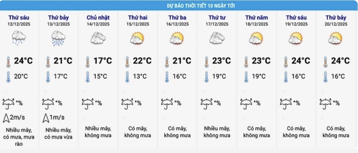 Ngày 19–20/12: Duy trì trạng thái khô ráo; nhiệt độ ban ngày khoảng 24°C, ban đêm giảm còn 16°C.