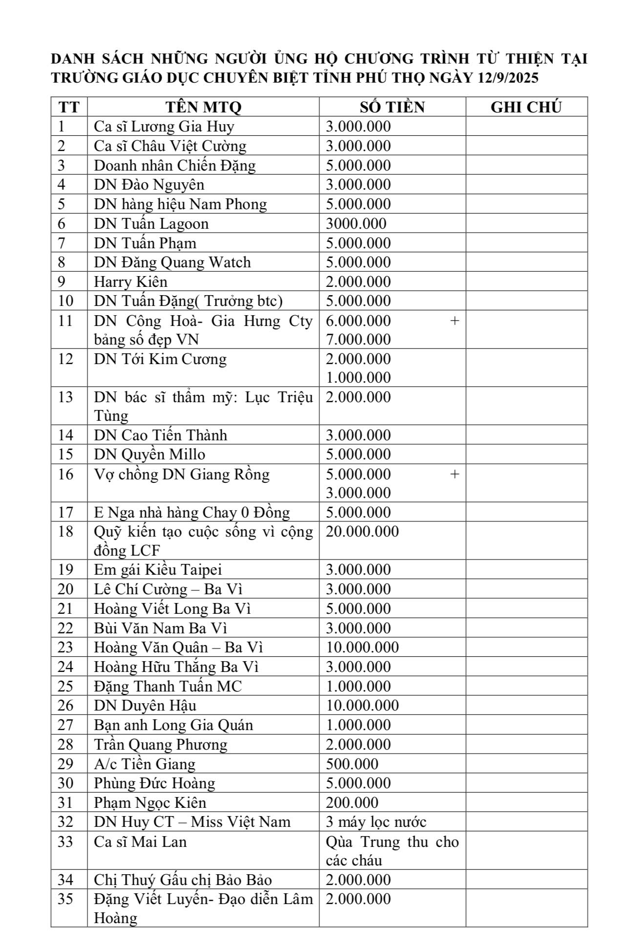 Danh sách những mạnh thường quân tham gia ủng hộ trương trình từ thiện ngày 12/9/2025