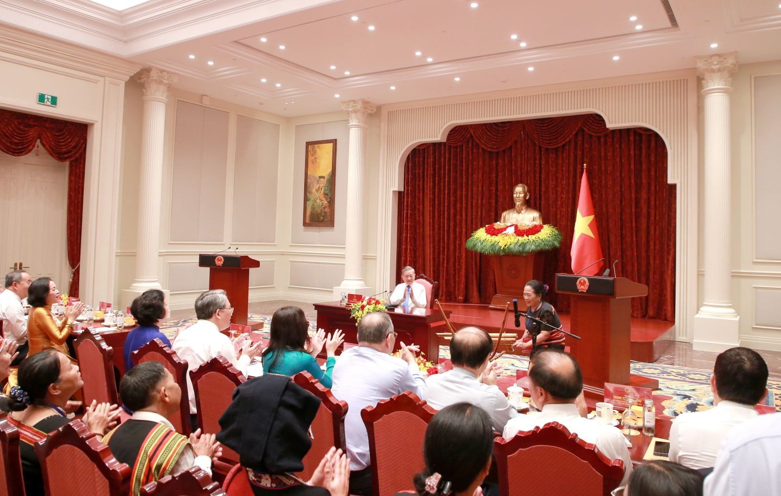 Trong không khí thắm tình đoàn kết, nghĩa đồng bào và niềm tự hào sâu sắc về bản sắc văn hóa Việt Nam, tại buổi tiếp, thay mặt lãnh đạo Đảng, Nhà nước, Tổng Bí thư, Chủ tịch nước Tô Lâm bày tỏ sự trân trọng và biết ơn sâu sắc đối với những đóng góp bền bỉ, thầm lặng nhưng hết sức to lớn của các già làng, trưởng bản, nghệ nhân, người có uy tín tiêu biểu trong đồng bào dân tộc thiểu số trên cả nước - những người đang gìn giữ cái gốc của dân tộc, giữ gìn những giá trị làm nên bản sắc, chiều sâu và sức mạnh bền vững của đất nước Việt Nam.